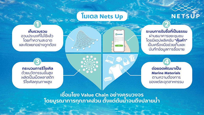 โมเดล “Nets Up” ได้เชื่อมโยงโซ่คุณค่า (Value Chain) อย่างครบวงจร โดยเริ่มต้นที่การจัดการอวนประมงที่ไม่ใช้แล้ว และนำเข้าระบบการซื้อขายของธนาคารขยะชุมชน ผ่านแอปพลิเคชัน “คุ้มค่า” จากนั้นจึงเข้าสู่กระบวนการรีไซเคิลเป็นเม็ดพลาสติกรีไซเคิลคุณภาพสูง และพัฒนาเป็น Marine Materials วัสดุรีไซเคิลจากอวนประมงไม่ใช้แล้ว เช่น วัสดุผ้าในธุรกิจสิ่งทอ บรรจุภัณฑ์ อุปกรณ์รองเท้ากีฬา ชิ้นส่วนยานยนต์ อุปกรณ์ไฟฟ้า เป็นต้น