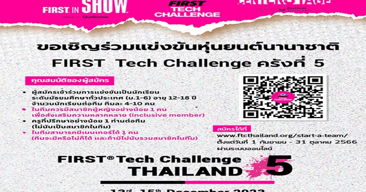 กรุงเทพฯ – 27 กันยายน 2566 - กลุ่มบริษัท ดาว ประเทศไทย (Dow) และพันธมิตร เปิดรับสมัครผู้ท้าชิงที่กำลังศึกษาอยู่ในระดับชั้น ม.1-ม.6 หรือเทียบเท่า ร่วมสร้างทีมจำนวน 4-10 คน (ควรมีสมาชิกผู้หญิงอย่างน้อย 1 คน (inclusive member) เพื่อส่งเสริมความหลากหลาย) เพื่อเข้าร่วมการแข่งขันหุ่นยนต์ FIRST® Tech Challenge Thailand ครั้งที่ 5 มุ่งสร้างเครือข่ายการเรียนรู้ STEM Education พัฒนาผู้เรียนด้านทักษะกระบวนการคิด การแก้ปัญหา การออกแบบ และการสร้างสรรค์นวัตกรรมเพื่อพิชิตภารกิจในหัวข้อ “CENTERSTAGE Presented by RTX” ระหว่างวันที่ 13-15 ธันวาคม 2566 ณ โรงเรียนปรินส์รอยแยลส์วิทยาลัย จ.เชียงใหม่ ชิงถ้วยพระราชทานสมเด็จพระกนิษฐาธิราชเจ้า กรมสมเด็จพระเทพรัตนราชสุดาฯ สยามบรมราชกุมารี พร้อมทุนการศึกษา ได้รับสิทธิ์ในการเป็นตัวแทนประเทศไทยเพื่อเข้าร่วมการแข่งขันระดับนานาชาติที่สหรัฐอเมริกา ผู้ที่สนใจเข้าร่วมการแข่งขันสามารถดูรายละเอียดการสมัครได้ที่ www.ftcthailand.org/start-a-team/ โดยปิดรับสมัครภายในวันที่ 31 ตุลาคม 2566 ท่านสามารถศึกษาข้อมูลเพิ่มเติมเกี่ยวกับการแข่งขันได้ที่ www.ftcthailand.org/ หรือสอบถามรายละเอียดได้ที่ Inbox ของ www.facebook.com/FIRSTTechChallengeTHAILAND