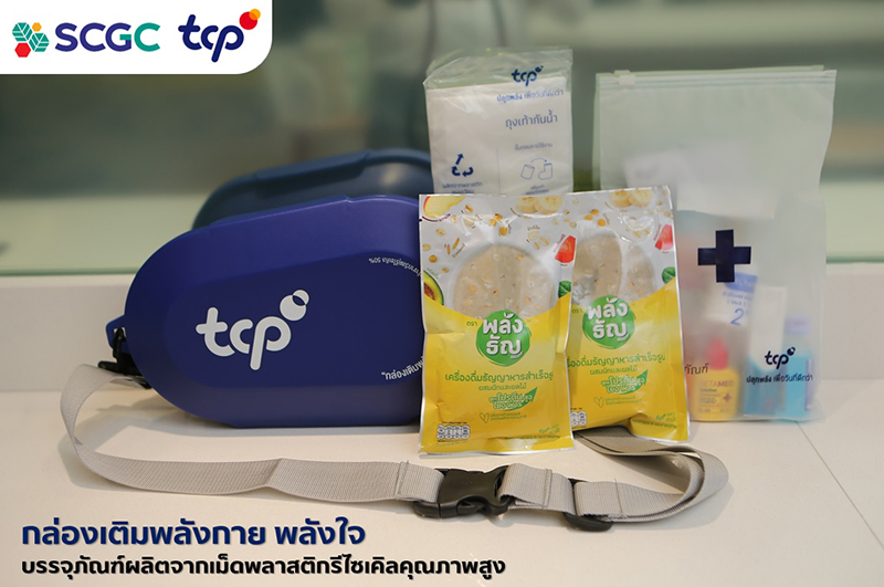 นอกจากนี้ SCGC ยังได้ร่วมกับกลุ่มธุรกิจ TCP พัฒนา “กล่องเติมพลังกาย พลังใจ” เพื่อเตรียมความพร้อมในการช่วยเหลือผู้ได้รับผลกระทบจากภัยพิบัติที่อาจเกิดขึ้นจากการเปลี่ยนแปลงสภาพภูมิอากาศ โดยกล่องผลิตจากเม็ดพลาสติกรีไซเคิลคุณภาพสูง (High Quality Post-Consumer Recycled Resin: PCR) มีคุณสมบัติกันน้ำ รองรับการกระแทก น้ำหนักเบา สามารถพกพาได้สะดวก และภายในกล่องบรรจุนวัตกรรมด้านอาหารจากกลุ่มธุรกิจ TCP ที่มีโปรตีนและเส้นใยอาหารสูงผลิตจากวัตถุดิบธรรมชาติ เพื่อให้ผู้ประสบภัยสามารถเข้าถึงความช่วยเหลือได้อย่างทันท่วงที