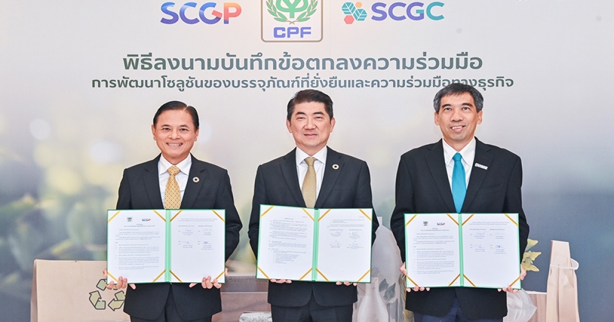 บริษัท เจริญโภคภัณฑ์อาหาร จำกัด (มหาชน) หรือ ซีพีเอฟ ร่วมกับพันธมิตร 2 บริษัทในกลุ่ม SCG ที่มุ่งเติบโตทางธุรกิจควบคู่กับการสร้างความยั่งยืน ลงนามบันทึกข้อตกลงความร่วมมือ (MoU) ด้านนวัตกรรมบรรจุภัณฑ์จากเยื่อกระดาษและพอลิเมอร์ กับบริษัทเอสซีจี แพคเกจจิ้ง จำกัด (มหาชน) หรือ SCGP และ ด้านนวัตกรรมพลาสติกที่เป็นมิตรกับสิ่งแวดล้อม (Green Polymer) กับบริษัท เอสซีจี เคมิคอลส์ จำกัด (มหาชน) หรือ SCGC โดยร่วมกันศึกษาพัฒนาโซลูชันบรรจุภัณฑ์สำหรับอาหารของซีพีเอฟ ที่เป็นมิตรต่อสิ่งแวดล้อม ลดการปล่อยก๊าซเรือนกระจก อีกทั้งสะอาดและปลอดภัยสำหรับผู้บริโภค พร้อมเปิดโอกาสพัฒนานวัตกรรมร่วมกับพันธมิตรทั้งในห่วงโซ่คุณค่า (Value Chain) ที่มีเป้าหมายความยั่งยืนร่วมกัน เพื่อขับเคลื่อนอุตสาหกรรมตามแนวทางดำเนินธุรกิจ ESG (Environmental, Social and Governance) และรองรับความต้องการของตลาดบรรจุภัณฑ์ที่เป็นมิตรกับสิ่งแวดล้อมในประเทศที่มีการเติบโตเพิ่มขึ้นอย่างต่อเนื่อง