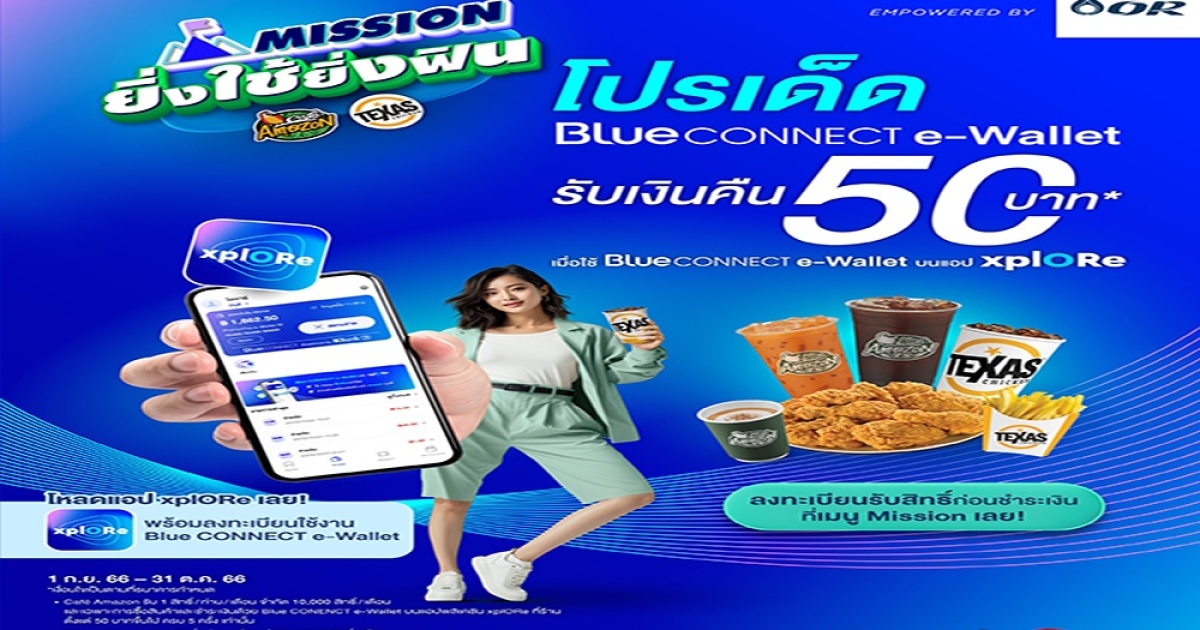 Blue CONNECT e-Wallet มอบโปรเด็ด “Mission ยิ่งใช้ยิ่งฟิน” ภารกิจการช้อปสุดคุ้ม บนกระเป๋าเงินออนไลน์ ที่เชื่อมต่อทุกการใช้จ่าย ใช้งานง่ายจ่ายครบจบทุกไลฟ์สไตล์ในร้านค้าเครือ OR เพียงใช้จ่ายด้วย Blue CONNECT e-Wallet บนแอป xplORe ที่ Café Amazon หรือ Texas Chicken รับเงินคืน 50 บาท รับสิทธิ์ง่าย ๆ แค่กดลงทะเบียนที่เมนู Mission จากนั้นให้คุณเลือกฟินไปกับเครื่องดื่มสุดโปรดจาก Café Amazon โดยชำระผ่าน Blue CONNECT e-Wallet ตั้งแต่ 50 บาทขึ้นไป ครบ 5 ครั้ง รับเงินคืน 50 บาท (จำกัด 1 สิทธิ์/ท่าน/ต่อเดือน เดือนละ 10,000 สิทธิ์) หรือจะเลือกอร่อยกับเมนูเด็ดจาก Texas Chicken โดยชำระผ่าน Blue CONNECT e-Wallet ตั้งแต่ 100 บาทขึ้นไป ครบ 2 ครั้ง รับเงินคืน 50 บาท (จำกัด 1 สิทธิ์/ท่าน/ต่อเดือน เดือนละ 2,000 สิทธิ์) ตั้งแต่วันนี้ – 31 ตุลาคม 2566