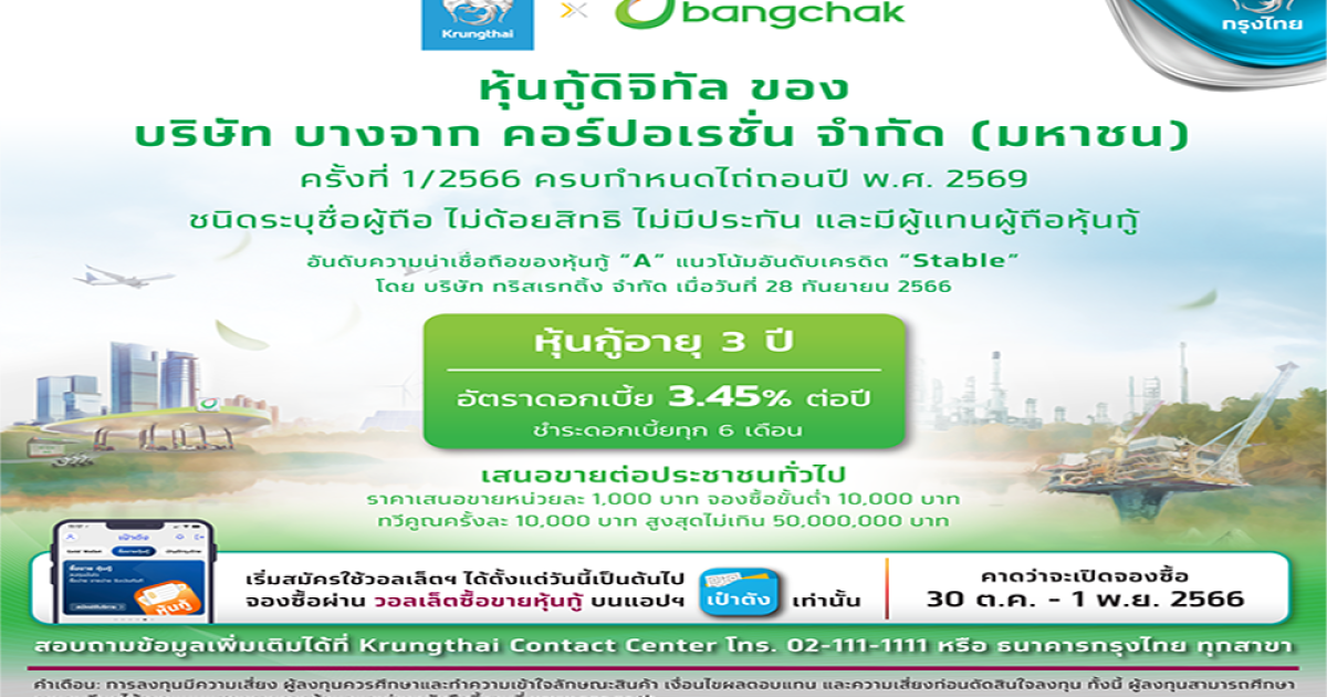 บริษัท บางจาก คอร์ปอเรชั่น จำกัด (มหาชน) ผนึก ธนาคารกรุงไทย เสนอขาย “หุ้นกู้ดิจิทัล บางจาก” บนแอปฯ เป๋าตัง ครั้งที่ 2 วงเงิน 3,000 ล้านบาท อัตราดอกเบี้ยคงที่ 3.45% ต่อปี เปิดโอกาสคนไทยเข้าถึงการลงทุนกับผู้นำธุรกิจโรงกลั่นน้ำมันของประเทศ ลงทุนเริ่มต้นเพียง 10,000 บาท “จองก่อน ได้ก่อน” ดีเดย์ 30 ต.ค.- 1 พ.ย.66