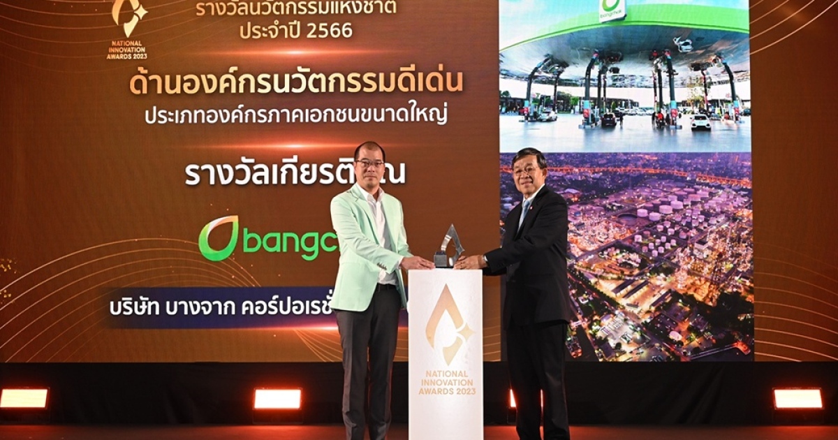 นายรวี บุญสินสุข ผู้ช่วยกรรมการผู้จัดการใหญ่ สายงานพัฒนาธุรกิจใหม่และนวัตกรรม บริษัท บางจาก คอร์ปอเรชั่น จำกัด (มหาชน) รับโล่รางวัลเกียรติคุณ ด้านองค์กรนวัตกรรมดีเด่น ประเภทองค์กรภาคเอกชนขนาดใหญ่ ประจำปี 2566 (Merit Prize for Innovative Organization Excellence for Large Private Sector Organization 2023) จาก รศ. นพ. สรนิต ศิลธรรม ประธานกรรมการ คณะกรรมการนวัตกรรมแห่งชาติ ในฐานะที่บางจากฯ เป็นองค์กรที่มีการบริหารจัดการวางแผนพัฒนาองค์กรอย่างต่อเนื่อง ผ่านโครงการและผลงานด้านนวัตกรรมต่าง ๆ เพื่อสร้างสรรค์สิ่งใหม่ทั้งภายในและนอกองค์กร เพื่อให้เกิดประโยชน์ต่อสังคมส่วนรวม ในงานรางวัลนวัตกรรมแห่งชาติ ประจำปี 2566 National Innovation Awards 2023 ณ รอยัล พารากอน ฮอลล์ สยามพารากอน จัดโดยสำนักงานนวัตกรรมแห่งชาติ (องค์การมหาชน)