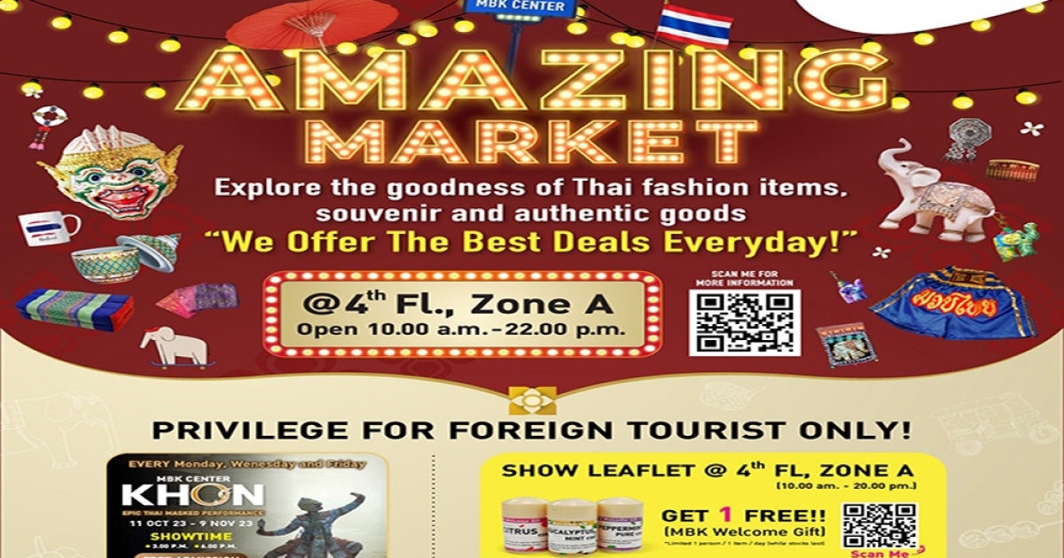ศูนย์การค้าเอ็ม บี เค เซ็นเตอร์ เปิดโซนใหม่ต้อนรับนักท่องเที่ยว AMAZING MARKET ชั้น 4 โซน A ตื่นตาตื่นใจกับของฝากของที่ระลึก รวบรวมของดีจากทุกท้องถิ่นทั่วประเทศไทยมาไว้ในที่เดียว ทั้งกางเกงช้างยอดนิยม กางเกงมวยไทย นวม กระเป๋าและเสื้อยืดลายสัญลักษณ์ความเป็นไทยแบบต่าง ๆ แก้วเซรามิคแก้วมัคเบญจรงค์ เครื่องหอม ก้านไม้หอม น้ำมันหอมระเหย เครื่องประดับ ตุ๊กตาช้างผ้า Magnet รถตุ๊กตุ๊ก โมเดลรถตุ๊กตุ๊ก ผ้าคลุมไหล่ผ้าไหม และของน่ารัก ๆ สื่อถึงความเป็นไทยอีกมากมาย