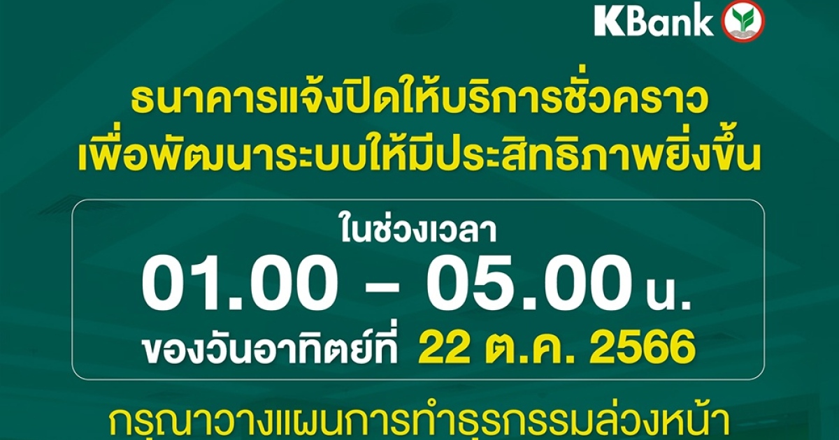 ธนาคารกสิกรไทยแจ้งจะปิดให้บริการชั่วคราว เพื่อพัฒนาระบบให้มีประสิทธิภาพยิ่งขึ้น ในวันอาทิตย์ที่ 22 ตุลาคม 2566 เวลา 01:00 น. – 05:00 น. ส่งผลให้ลูกค้าไม่สามารถใช้บริการดังนี้ได้