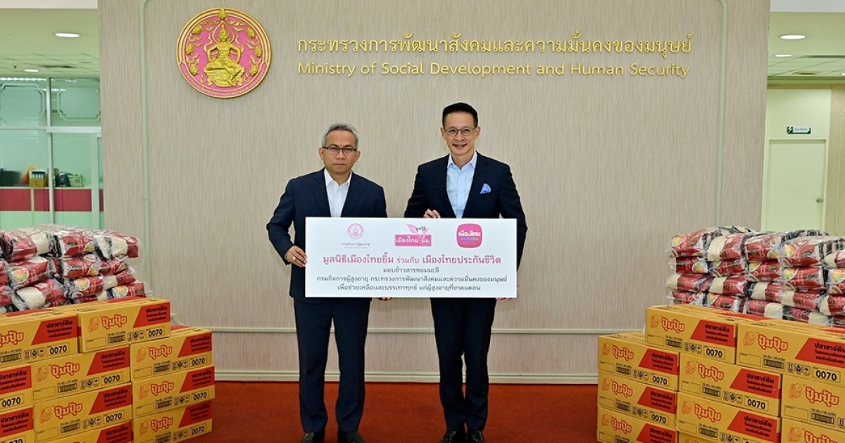 นายสาระ ล่ำซำ ประธานเจ้าหน้าที่บริหาร บริษัท เมืองไทยประกันชีวิต จำกัด (มหาชน) และนางพิตราภรณ์ บุณยรัตพันธุ์ รองประธานกรรมการ มูลนิธิเมืองไทยยิ้ม ร่วมมอบเครื่องบริโภค ได้แก่ ข้าวสารและปลากระป๋อง ให้แก่ นายอนุกูล ปีดแก้ว ปลัดกระทรวงการพัฒนาสังคมและความมั่นคงของมนุษย์ เพื่อส่งเสริมและสนับสนุนการบริหารจัดการของทางภาครัฐ ส่งมอบให้กับผู้สูงอายุและกลุ่มเปราะบางที่ประสบปัญหาความเดือดร้อนทางสังคม โดยเฉพาะผู้ได้รับผลกระทบจากอุทกภัยในพื้นที่ต่าง ๆ โดยมี นางสาวแรมรุ้ง วรวัธ อธิบดีกรมกิจการผู้สูงอายุ นางอภิญญา ชมภูมาศ อธิบดีกรมกิจการเด็กและเยาวชน นายธนสุนทร สว่างสาลี รองปลัดกระทรวงการพัฒนาสังคมและความมั่นคงของมนุษย์ นายกันตพงศ์ รังษีสว่าง รองปลัดกระทรวงการพัฒนาสังคมและความมั่นคงของมนุษย์ และ นายอนันต์ ดนตรี หัวหน้าผู้ตรวจราชการกระทรวงการพัฒนาสังคมและความมั่นคงของมนุษย์ ร่วมในพิธี ณ อาคารกรมพัฒนาสังคมและสวัสดิการ กระทรวงการพัฒนาสังคมและความมั่นคงของมนุษย์ สะพานขาว กรุงเทพฯ เมื่อเร็วๆ นี้