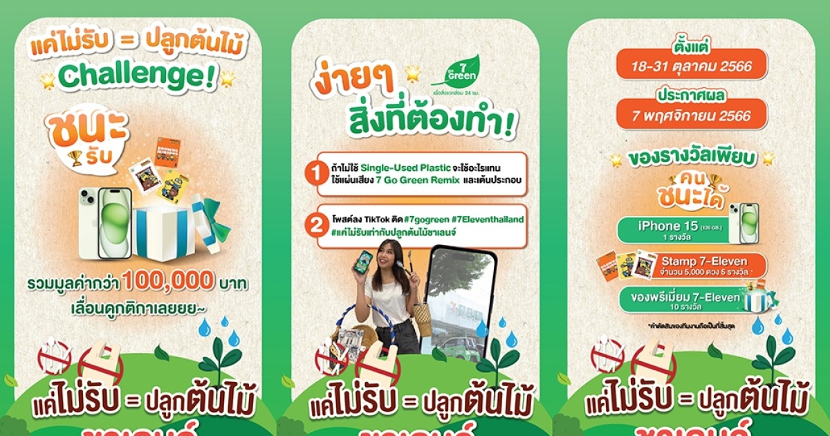 - ติดแฮชแท็ก #7gogreen #7Eleventhailand #แค่ไม่รับเท่ากับปลูกต้นไม้ชาเลนจ์
