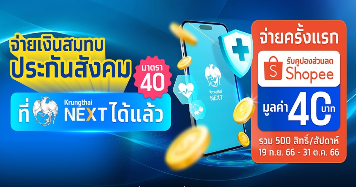 พิเศษ! ผู้ประกันตนมาตรา 40 ที่ชำระเงินสมทบเข้ากองทุนประกันสังคมผ่านแอปฯ Krungthai NEXT เป็นครั้งแรก ระหว่างวันที่ 19 กันยายน - 31 ตุลาคม 2566 รับฟรีคูปองส่วนลด Shopee มูลค่า 40 บาท (จำกัดสิทธิการรับคูปองส่วนลด 500 สิทธิต่อสัปดาห์)