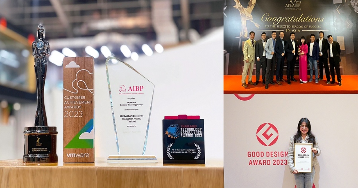 3. รางวัล AIBP Enterprise Innovation Awards 2023 สำหรับโปรแกรม KBTG Transformation ที่ช่วยเพิ่ม Productivity และ Quality ในการพัฒนาซอฟต์แวร์ ทำให้ KBTG สามารถส่งมอบโปรเจคไอทีได้ปริมาณมากขึ้น รวมถึงลดจำนวน Incident ลงถึง 60% ให้ผู้ใช้งานสามารถเข้าถึงผลิตภัณฑ์และบริการต่างๆ ของธนาคารกสิกรไทยและ KBTG ได้อย่างไม่มีสะดุด จัดโดย ASEAN Innovation Business Platform (AIBP) หน่วยงานธุรกิจของ Industry Platform บริษัทด้าน Growth Consulting ในประเทศสิงคโปร์ โดยมอบให้กับองค์กรที่มีผลงานโดดเด่นด้าน Digital Transformation และ Innovation ในภูมิภาคอาเซียน รวมทั้งสิ้น 5 ประเทศ ได้แก่ อินโดนีเซีย มาเลเซีย ฟิลิปปินส์ เวียดนาม และไทย