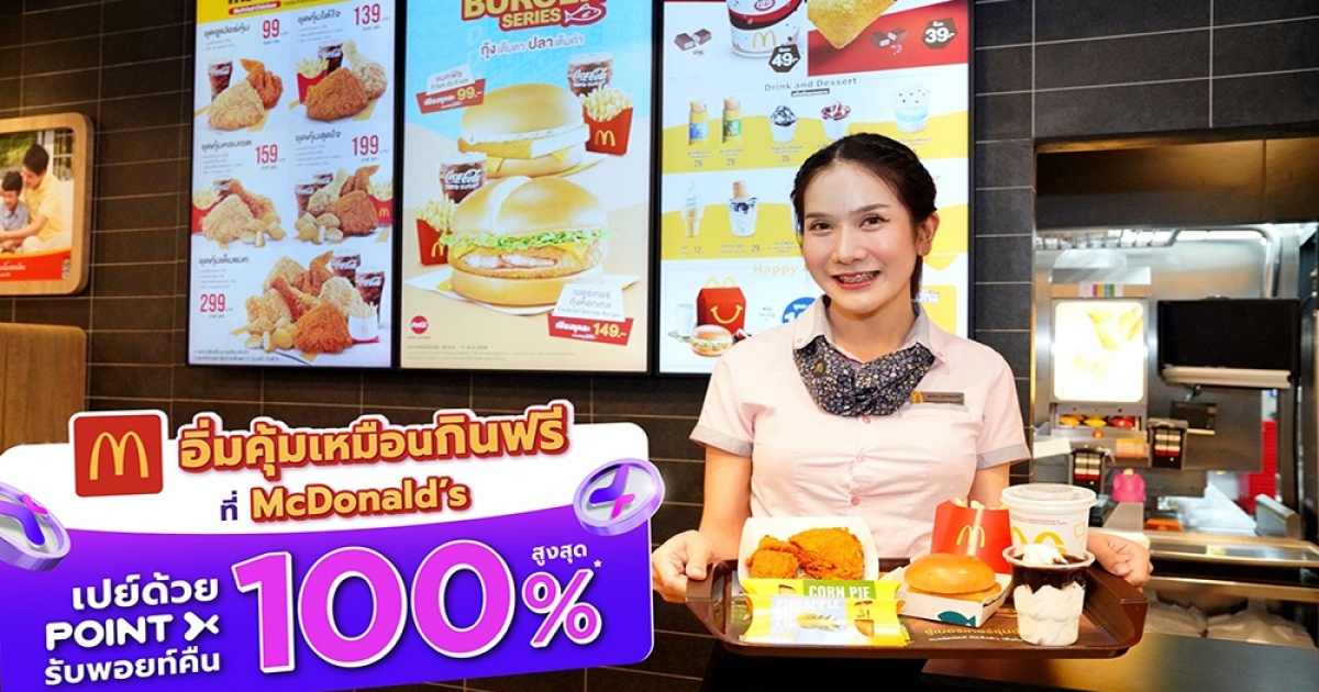 “PointX” (พอยท์เอกซ์) แพลตฟอร์มที่รวมทุกคะแนนสะสมไว้ในที่เดียว เปลี่ยนประสบการณ์การใช้และสะสมพอยท์แบบไร้ขีดจำกัดให้สามารถใช้พอยท์ได้เหมือนเงินสด ส่งแคมเปญเอาใจสายกิน “อิ่มคุ้ม ที่ McDonald’s” รับพอยท์คืนสูงสุด 100% เมื่อใช้ PointX สแกนชำระค่าอาหารและเครื่องดื่ม (รับพอยท์คืน 100% เฉพาะ 100 รายการใช้จ่ายแรกต่อสัปดาห์ จำกัดพอยท์คืนสูงสุด 1,500 PointX / ท่าน / รายการใช้จ่าย ) โดยครั้งนี้ PointX หวังเป็นอย่างยิ่งว่าแคมเปญนี้จะสามารถส่งมอบความสุขให้คนรักอาหารได้อิ่มคุ้มทุกมื้อกับ McDonald’s ตั้งแต่วันนี้ – 31 ธันวาคม 2566 สอบถามข้อมูลเพิ่มเติมได้ที่ SCB Call Center 02-777-7777 หรือเว็บไซต์ https://pointx.scb/mcdonalds-2023/ และสามารถดาวน์โหลดแอปพลิเคชัน PointX ฟรี ได้ที่ https://onelink.to/gqb7xm