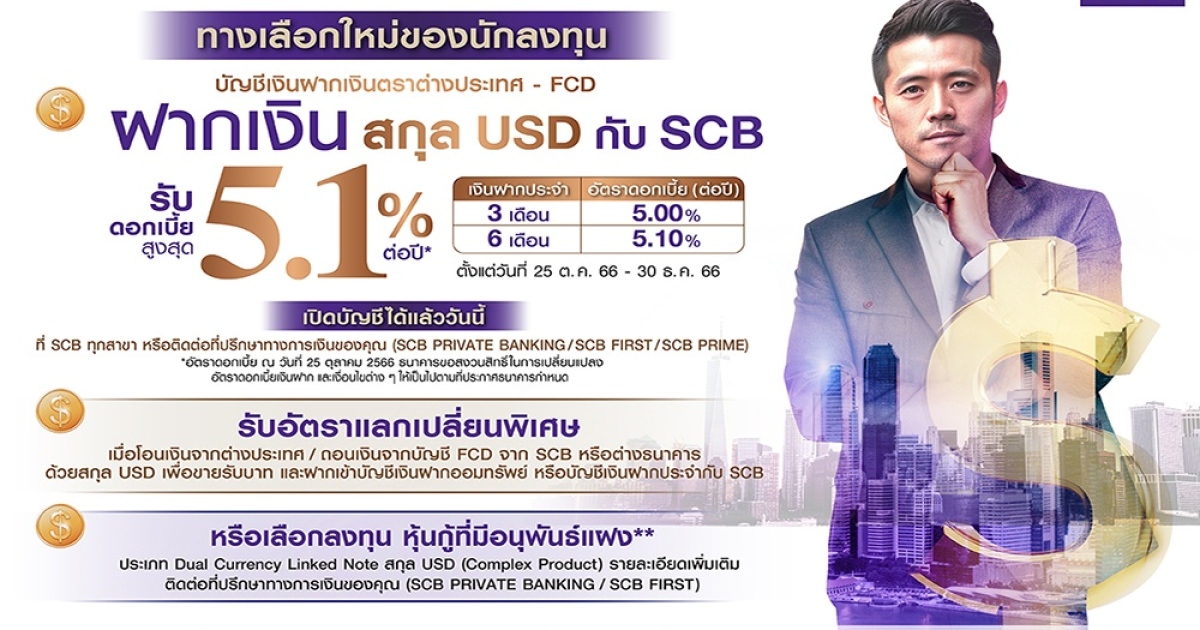 SCB ส่ง “บัญชีเงินฝากประจำ สกุลเงิน USD” รับดอกเบี้ยสูงสุด 5.10% ต่อปี ทางเลือกใหม่ของการออมเงิน สู่ความมั่งคั่งทางการเงิน