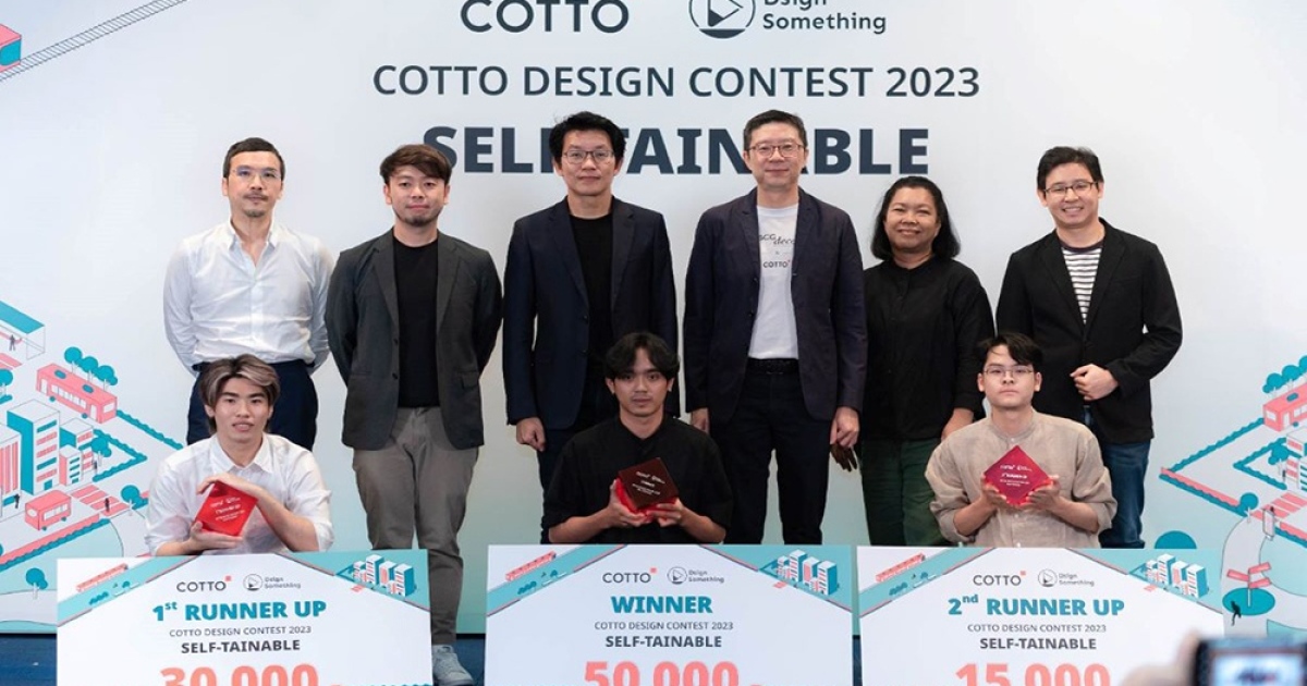 COTTO ผู้นำเทรนด์ ด้วยนวัตกรรมที่มาพร้อมโซลูชั่น หนึ่งในผลิตภัณฑ์ของ บริษัท เอสซีจี เซรามิกส์ จำกัด (มหาชน)โดยนายสิทธิชัย สุขกิจประเสริฐ (ที่ 3 จากขวา) กรรมการผู้จัดการ บริษัท สยามซานิทารีแวร์ จำกัด และ Chief Marketing Officer บริษัทเอสซีจี เซรามิกส์ จำกัด มหาชน ร่วมกับ นายเอกราช ลักษณสัมฤทธิ์ (ที่ 2 จากซ้าย) สถาปนิกและผู้ก่อตั้ง SomethingDesign มอบรางวัลให้กับทีมผู้ชนะเลิศการประกวด COTTO DESIGN CONTEST 2023 ผ่านแนวคิด Self-tainable การออกแบบพื้นที่สาธารณะขนาดย่อมที่แก้ไขปัญหาด้านความยั่งยืนในแบบของตน เพื่อสนับสนุนให้นักออกแบบรุ่นใหม่เติบโตไปในสายงานออกแบบบที่ยังคงความเป็นตัวตน พร้อมนำแนวคิดเชิงสถาปัตย์มาเพื่อช่วยคลีคลายปัญหาสังคม ชุมชน และโลกใบนี้ ณ หอศิลปวัฒนธรรม กรุงเทพมหานคร