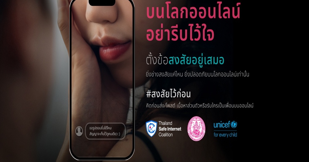กรุงเทพฯ, 7 พฤศจิกายน 2566 - องค์การยูนิเซฟ ประเทศไทย ร่วมกับกระทรวงการพัฒนาสังคมและความมั่นคงของมนุษย์ (พม.) และเครือข่ายเสริมสร้างอินเทอร์เน็ตปลอดภัย ประเทศไทย เปิดตัว แคมเปญรณรงค์ #สงสัยไว้ก่อน เพื่อส่งเสริมให้เด็กและเยาวชนรู้จัก “คิดทบทวนให้ถี่ถ้วน” ก่อนจะโพสภาพ วิดีโอ หรือข้อมูลส่วนตัวบนพื้นที่ออนไลน์ โดยแคมเปญนี้มีวัตถุประสงค์เพื่อคุ้มครองเด็กและเยาวชนจากการล่วงละเมิดและแสวงประโยชน์ทางเพศทางออนไลน์ หลังจากที่รายงานการศึกษาล่าสุดชี้ให้เห็นว่า เด็กในประเทศไทยจำนวนมากกำลังตกเป็นผู้เสียหายจากการล่วงละเมิดและการแสวงประโยชน์ทางเพศทางออนไลน์
