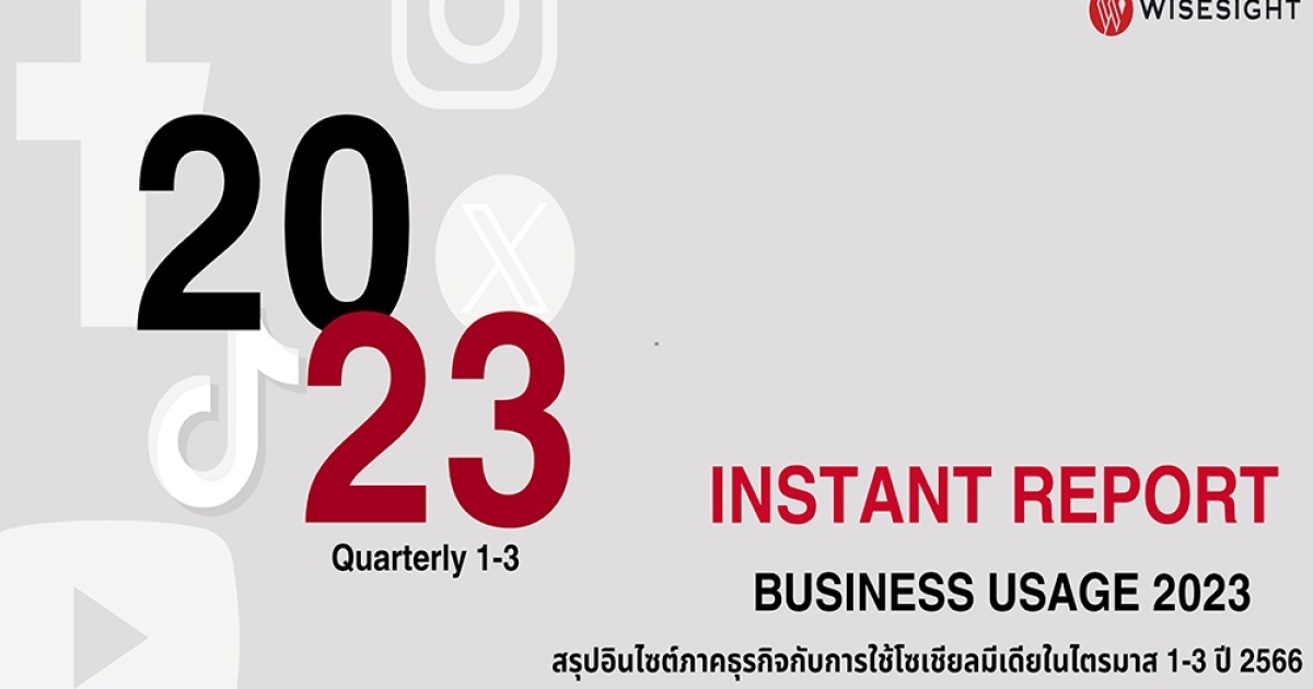 ไวซ์ไซท์ (ประเทศไทย) ได้ทำการรวบรวมข้อมูลและสถิติการใช้งาน Facebook, X, Instagram, YouTube, และ TikTok ของภาคธุรกิจกว่า 2,000 แบรนด์ชั้นนำจาก 20 กลุ่มอุตสาหกรรม โดยวิเคราะห์ข้อมูลกว่า 3 ล้านข้อความที่เกิดขึ้นตลอดทั้งปี 2566 ระหว่างวันที่ 1 มกราคม - 30 กันยายน 2566 ผ่าน “INSTANT REPORT BUSINESS USAGE ภาพรวมการใช้งานโซเชียลมีเดียเชิงธุรกิจไตรมาส 1-3 2566” โดยมีสรุป 15 สาระสำคัญ ดังนี้