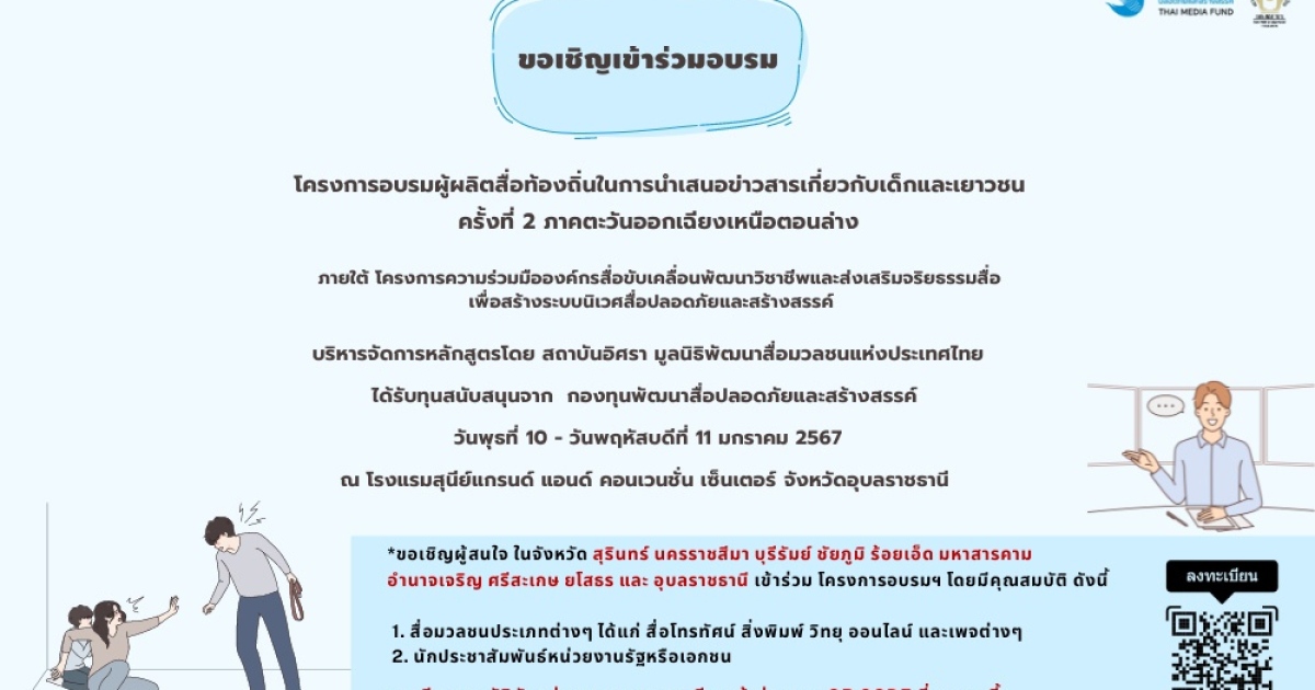 ด้วย สถาบันอิศรา มูลนิธิพัฒนาสื่อมวลชนแห่งประเทศไทย ร่วมกับ กองทุนพัฒนาสื่อปลอดภัยและสร้างสรรค์ จัด “โครงการอบรมผู้ผลิตสื่อท้องถิ่นในการนำเสนอข่าวสารเกี่ยวกับเด็กและเยาวชน ครั้งที่ 2 ภาคตะวันออกเฉียงเหนือตอนล่าง” ในวันพุธที่ 10 - วันพฤหัสบดีที่ 11 มกราคม 2567 ณ โรงแรมสุนีย์แกรนด์ แอนด์ คอนเวนชั่น เซ็นเตอร์ จังหวัดอุบลราชธานี
