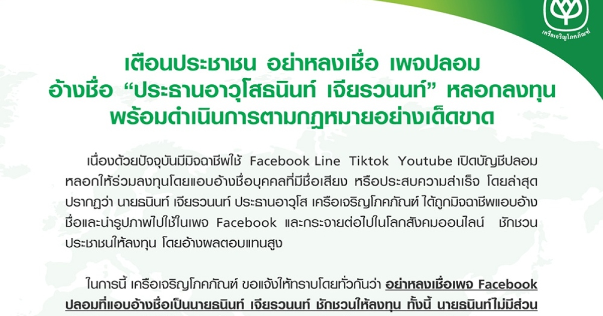 ซีพี เตือนประชาชน อย่าหลงเชื่อ เพจปลอมอ้างชื่อ 'ประธานอาวุโสธนินท์ เจียรวนนท์' หลอกลงทุน พร้อมดำเนินการตามกฎหมายอย่างเด็ดขาด