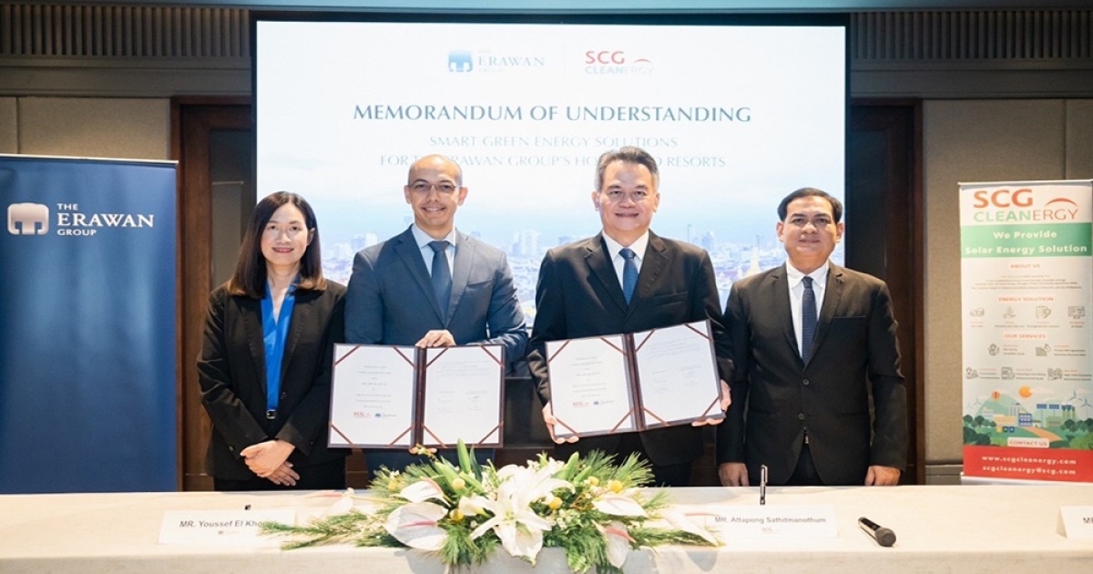 นายยูเซฟ อิล คัมริ กรรมการผู้จัดการใหญ่ (ที่ 2 จากซ้าย) และนางสาววรมน อิงคตานุวัฒน์ รองกรรมการผู้จัดการ และประธานเจ้าหน้าที่การเงิน (ที่ 1 จากซ้าย) บริษัท ดิ เอราวัณ กรุ๊ป จำกัด (มหาชน) ผู้ลงทุนและพัฒนาธุรกิจโรงแรมในประเทศไทย ฟิลิปปินส์ และญี่ปุ่น ประกอบธุรกิจโรงแรมด้วยมาตรฐานระดับสากลครอบคลุมตั้งแต่โรงแรมระดับ 5 ดาว จนถึงโรงแรมระดับบัดเจ็ท ลงนามบันทึกข้อตกลงความร่วมมือกับ นายอรรถพงศ์ สถิตมโนธรรม ประธานเจ้าหน้าที่บริหาร (ที่ 3 จากซ้าย) และนายอภิเชษฐ นุ้ยตูม รองประธานเจ้าหน้าที่ปฏิบัติการ (ที่ 4 จากซ้าย) บริษัท เอสซีจี คลีนเนอร์ยี่ จำกัด ผู้ให้บริการผลิตและจำหน่ายไฟฟ้าจากพลังงานแสงอาทิตย์แบบครบวงจรกับกลุ่มนิคมอุตสาหกรรม โรงแรม โรงพยาบาล และห้างสรรพสินค้า เพื่อนำเทคโนโลยีด้านพลังงานไฟฟ้าระบบ Smart Energy มาใช้ในโรงแรมและรีสอร์ตในเครือ “ดิ เอราวัณ กรุ๊ป” ยกระดับการใช้พลังงานหมุนเวียนที่เป็นมิตรต่อสิ่งแวดล้อมในธุรกิจการท่องเที่ยวและโรงแรม