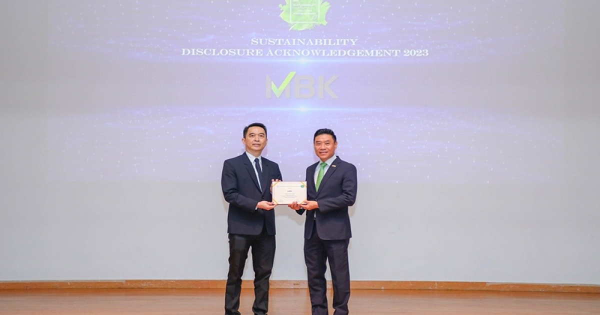 นายเกษมสุข จงมั่นคง ประธานเจ้าหน้าที่บริหารศูนย์สนับสนุนองค์กร บริษัท เอ็ม บี เค จำกัด (มหาชน) (ขวา) รับรางวัลกิตติกรรมประกาศ Sustainability Disclosure Acknowledgement 2023 ต่อเนื่องเป็นปีที่ 3 ในพิธีมอบรางวัลการเปิดเผยข้อมูลความยั่งยืน ประจำปี 2566 ในโอกาสที่ บริษัท เอ็ม บี เค จำกัด (มหาชน) ให้ความสำคัญกับการเผยแพร่ข้อมูลการดำเนินงานด้านความยั่งยืน ซึ่งครอบคลุมทั้งการดำเนินงานด้านเศรษฐกิจ สังคม สิ่งแวดล้อม หรือด้าน ESG (Environmental, Social and Governance) ที่เป็นประโยชน์ต่อกลุ่มผู้มีส่วนได้เสียของกิจการ และการพัฒนาองค์กรสู่ความยั่งยืนในระยะยาว โดยมี ดร.พิพัฒน์ ยอดพฤติการ ประธานสถาบันไทยพัฒน์ (ซ้าย) เป็นผู้มอบ ณ ห้องออดิทอเรียม ชั้น 5 หอศิลปวัฒนธรรมแห่งกรุงเทพมหานคร เมื่อเร็ว ๆ นี้