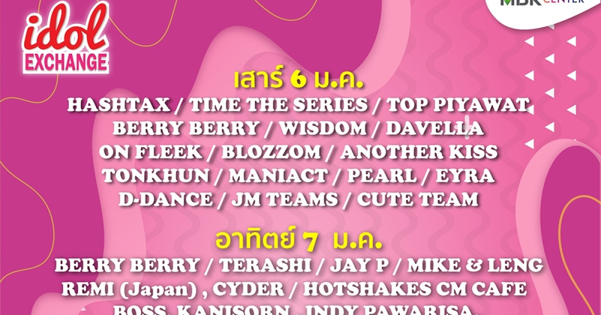ประเดิมครั้งแรกของปีชวนมาฉลองการจัดงาน Idol Exchange ครั้งที่ 40 ในวันเสาร์ที่ 6 และ วันอาทิตย์ที่ 7 มกราคม 2567 พบกับเหล่าไอดอล T-Pop ทั้งบอยกรุ๊ปเกิร์ลกรุ๊ป นำโดย BERRY BERRY / HASHTAX / TIME THE SERIES / TOP PIYAWAT / WISDOM / DAVELLA ON FLEEK / BLOZZOM / ANOTHER KISS TONKHUN / MANIACT / PEARL / EYYA / D-DANCE / JM TEAM / CUTE TEAM / TERASHI / JAY P / MIKE & LENG / REMI, CYDER / HOTSHAKES CM CAFÉ / BOSS, KANISORN, INDY PAWARISA, SAAIN- BNC RECORDS / YOLO SQUAD AR ENTERTAINMENT / GMTA ENTERTAINMENT / TWENTY TWO IDOL YURI, JAYJAY, VIOLET TWINS, LADA IS ENTERTAINMENT HUNZNAE KITTISAK / CAKE KEERATIRAT JM TEAM และ TJ TEAM