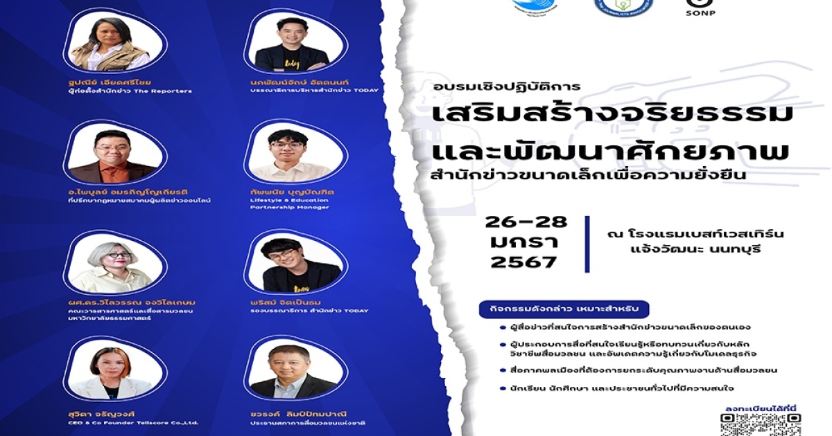 ระหว่างวันที่ 26-28 มกราคม นี้ ณ โรงแรมเบสท์เวสเทิร์นพลัสแวนด้าแกรนด์ แจ้งวัฒนะ นนทบุรี เพื่อเสริมทักษะวิชาชีพสื่อมวลชนและความรู้ต่างๆ ให้กับผู้ที่สนใจสร้างสำนักข่าวขนาดเล็กของตนเอง สนใจสมัครด่วน รับจำนวนจำกัด