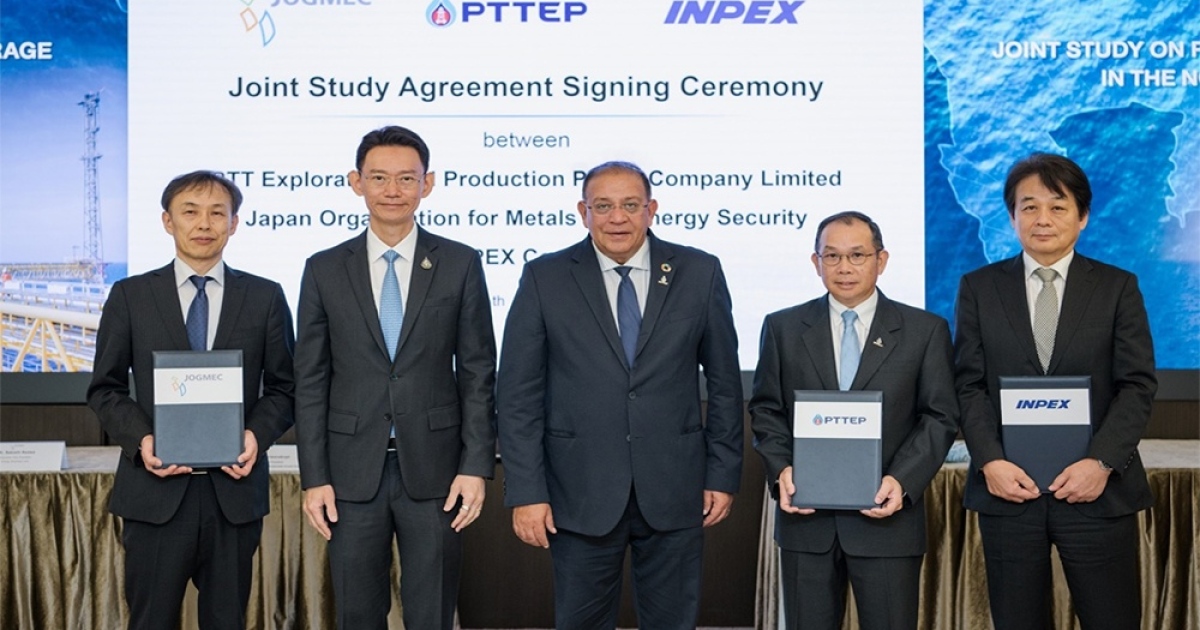 ดร.พูลพัฒน์ ลีสมบัติไพบูลย์ (ที่ 2 จากซ้าย) รองอธิบดีกรมเชื้อเพลิงธรรมชาติ กระทรวงพลังงาน และนายมนตรี ลาวัลย์ชัยกุล (กลาง) ประธานเจ้าหน้าที่บริหาร บริษัท ปตท.สำรวจและผลิตปิโตรเลียม จำกัด (มหาชน) หรือ ปตท.สผ. ให้เกียรติเข้าร่วมในพิธีลงนามข้อตกลงในการร่วมศึกษาและประเมินศักยภาพชั้นหินธรณีวิทยาเพื่อกักเก็บคาร์บอน บริเวณอ่าวไทยตอนบน ระหว่าง ปตท.สผ. ซึ่งลงนามโดยนายนภสิทธิ์ ชัยวรรณคุปต์ (ที่ 2 จากขวา) รักษาการรองกรรมการผู้จัดการใหญ่ กลุ่มงานเทคโนโลยี คาร์บอนโซลูชั่นและการเติบโตอย่างยั่งยืน และ Japan Organization for Metals and Energy Security (JOGMEC) ซึ่งลงนามโดย Mr. Satoshi Asawa (ซ้ายสุด) Executive Vice President of Energy Business Unit, และ INPEX CORPORATION ลงนามโดย Mr. Toshiaki Takimoto (ขวาสุด) Director, Managing Executive Officer, Senior Vice President of Hydrogen & CCUS Development