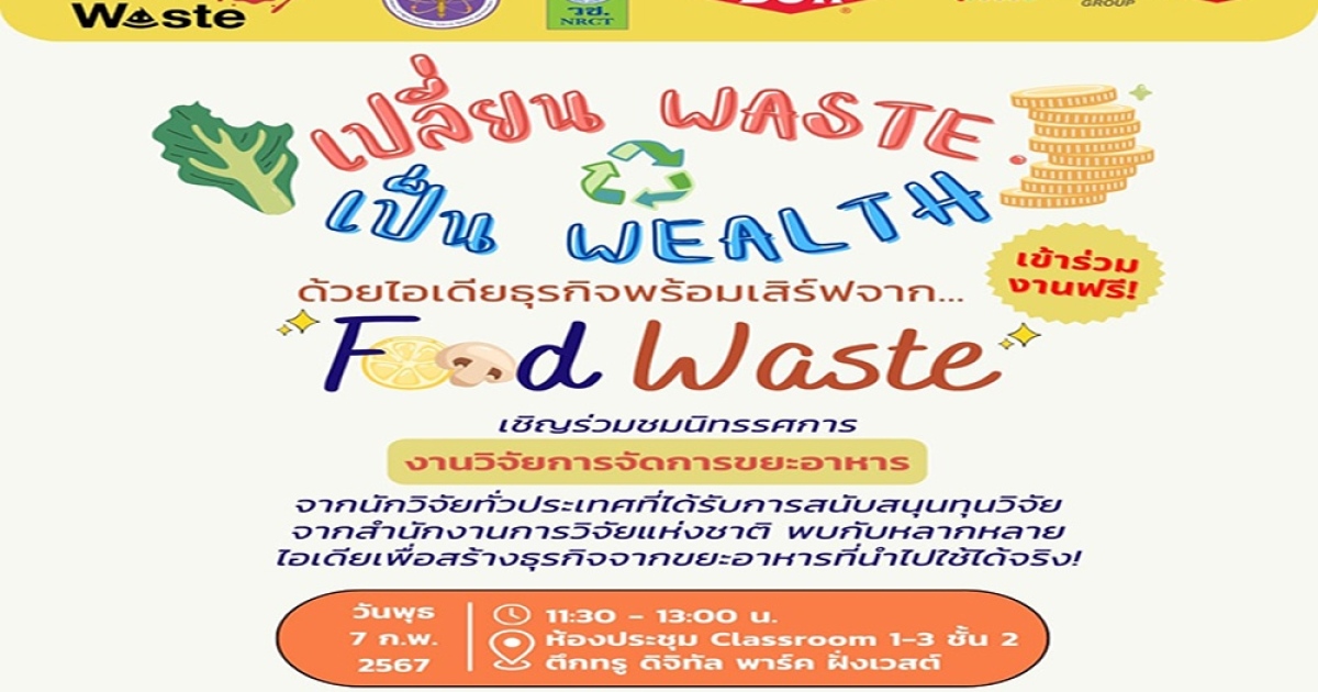 กรุงเทพฯ – 22 มกราคม 2567 - สำนักงานการวิจัยแห่งชาติ (วช.) ร่วมกับ กลุ่มบริษัท ดาว ประเทศไทย (Dow) ขอเชิญเอสเอ็มอี สตาร์ทอัพ และผู้ที่สนใจเข้าร่วมงาน “เปลี่ยน Waste เป็น Wealth ด้วยไอเดียธุรกิจพร้อมเสิร์ฟจาก Food Waste” พร้อมชมนิทรรศการ งานวิจัยการจัดการขยะอาหารจากนักวิจัยทั่วประเทศที่ได้รับการสนับสนุนทุนวิจัยจาก วช. พบกับหลากหลายไอเดียเพื่อสร้างธุรกิจจากขยะอาหารที่นำไปใช้ได้จริง พร้อมเปิดตัวแพลตฟอร์มออนไลน์ เพื่อเผยแพร่นวัตกรรมการจัดการขยะอาหารที่รวบรวมแนวทางการจัดการขยะอาหารไว้ครบครันในที่เดียว เข้าร่วมงานฟรีไม่มีค่าใช้จ่าย วันพุธที่ 7 กุมภาพันธ์ 2567 ณ อาคารทรู ดิจิทัล พาร์ท เวสต์ ห้องประชุม Classroom 1-3 ชั้น 2 ตั้งแต่เวลา 11.30 -13.00 น.