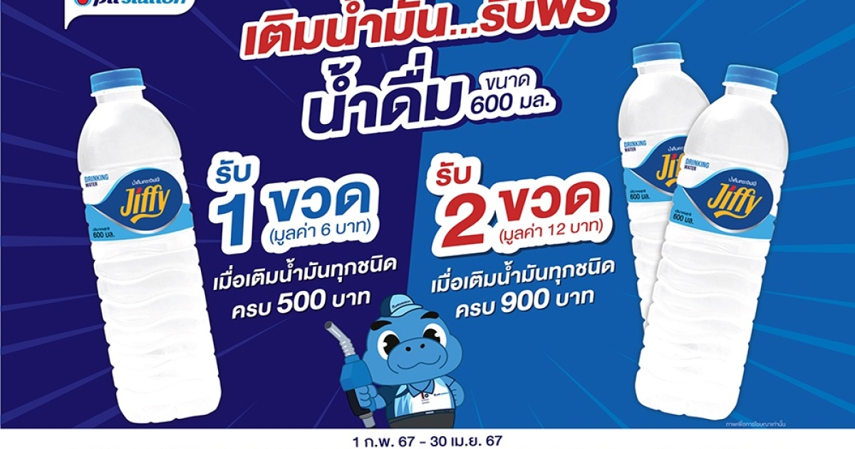 พีทีที สเตชั่น จัดโปร เติมน้ำมัน รับฟรีน้ำดื่ม เมื่อเติม XTRA SAVE ทุกชนิดครบ 500 บาท/ใบเสร็จ รับฟรีน้ำดื่มจิฟฟี่ จำนวน 1 ขวด