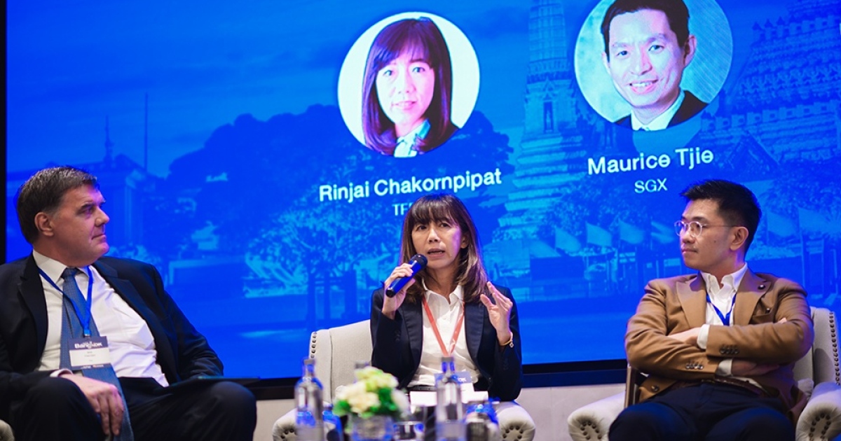 รินใจ ชาครพิพัฒน์ กรรมการผู้จัดการ บมจ. ตลาดสัญญาซื้อขายล่วงหน้า (ประเทศไทย) (TFEX) (ที่ 2 จากซ้าย) ให้ข้อมูลพัฒนาการตลาดอนุพันธ์ไทยและแลกเปลี่ยนมุมมองในหัวข้อ “The Regional Futures Industry” ร่วมกับผู้บริหารจากตลาดอนุพันธ์ประเทศญี่ปุ่น ใต้หวัน สิงคโปร์ และอินเดีย ในการประชุมสมาพันธ์ตลาดอนุพันธ์สากล ครั้งที่ 26 ซึ่ง TFEX เป็นเจ้าภาพ จัดขึ้นวันที่ 1-2 กุมภาพันธ์ 2567 โดยมีผู้เกี่ยวข้องในแวดวงอนุพันธ์และวิทยากรผู้ทรงคุณวุฒิจาก 29 ประเทศทั่วโลกมาร่วมงาน ผู้สนใจสามารถติดตามข้อมูลการประชุมดังกล่าวได้ที่ www.TFEX.co.th