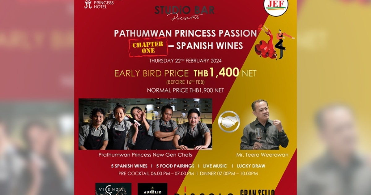 ร่วมดื่มด่ำกับค่ำคืนสุดพิเศษ ลิ้มลองเมนูที่คัดสรรมาเป็นพิเศษโดยนิวเจนเชฟทั้ง 5 จากโรงแรมปทุมวันปริ๊นเซส พบกับคุณธีระ วีรวรรณ ผู้เชี่ยวชาญเรื่องไวน์ ที่จะมาแนะนำไวน์ชั้นนำจากประเทศสเปน 5 ประเภท จับคู่กับอาหารอีก 5 เมนู! พร้อมเพลิดเพลินกับดนตรีสด และลุ้นรางวัลพิเศษ Pre Cocktail เริ่มเวลา 18.00-19.00 น. และเสิร์ฟดินเนอร์ เวลา 19.00-22.00 น.ราคาสุทธิ ต่อท่าน 1,900 บาท หรือราคาพิเศษ Early Bird เพียง 1,400 บาทสุทธิต่อท่าน เมื่อจองก่อนวันที่ 16 กุมภาพันธ์ 2567