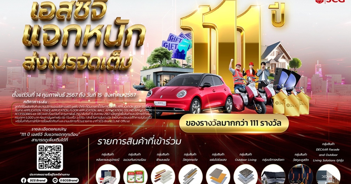 เอสซีจี ผู้นำด้านนวัตกรรมวัสดุก่อสร้างครบวงจร เดินหน้าส่งแคมเปญใหญ่แห่งปี “111 ปี เอสซีจี จับแจกแตกทุกเดือน” ในโอกาสฉลองครบรอบ 111 ปี เอสซีจี จับแจกทั่วไทยแจกใหญ่ทุกภาคทั่วประเทศ เริ่ม! 14 กุมภาพันธ์ 2567 - 15 สิงหาคม 2567 ของรางวัลมากกว่า 111 รางวัล รวมมูลค่ากว่า 1.5 ล้านบาท