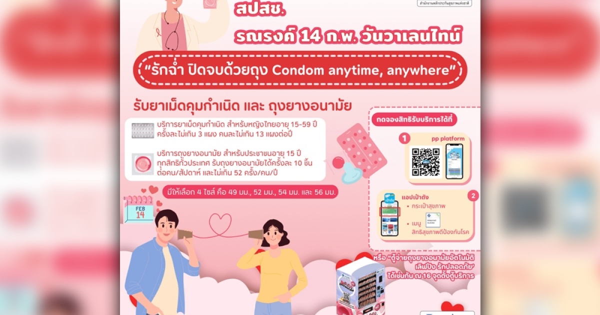 14 ก.พ. วันวาเลนไทน์ สปสช. ร่วมรณรงค์ “รักฉ่ำ ปิดจบด้วยถุง Condom anytime, anywhere.” สนับสนุนกรมควบคุมโรค กระตุ้นทุกคน ทุกเพศ ทุกวัย “พกถุงยางอนามัยติดตัวไว้พร้อมใช้และใช้ทุกครั้งเมื่อมีเพศสัมพันธ์” พร้อมแนะนำสิทธิประโยชน์บัตรทองเพื่อคนไทยทุกสิทธิ ครอบคลุมบริการยาคุมกำเนิดและบริการถุงยางอนามัย ช่วยป้องกันปัญหาท้องไม่พร้อมและโรคติดต่อทางเพศสัมพันธ์