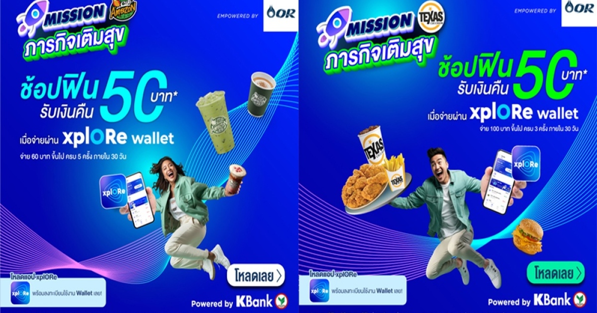 xplORe ชวนช้อปฟินไปกับ Mission ภารกิจเติมสุข รับเงินคืนสูงสุด 50 บาท เมื่อใช้จ่ายผ่าน xplORe wallet ที่ Café Amazon และ Texas Chicken