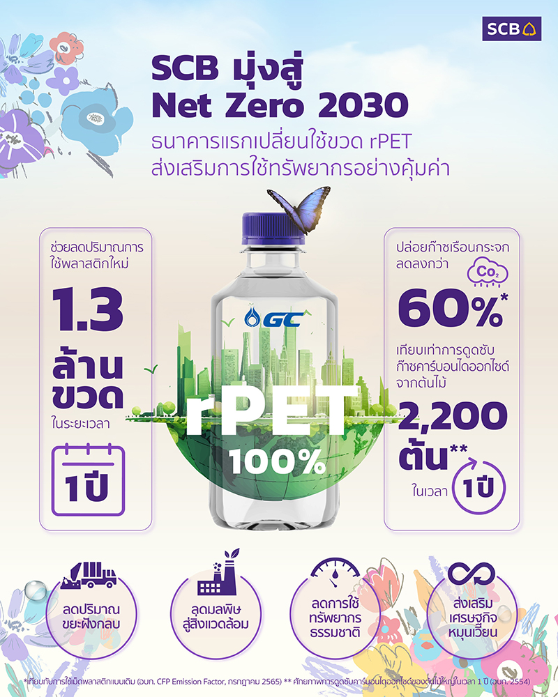 ไทยพาณิชย์เดินหน้าความยั่งยืนให้กับสังคมไทย เริ่มจากการดำเนินงานภายในของธนาคารควบคู่ไปกับการมอบความยั่งยืนให้ลูกค้าและคู่ค้า ตามพันธกิจ Net Zero จากการดำเนินงานภายในปี 2030 ประกาศความพร้อมเปลี่ยนขวดน้ำดื่มเพื่อใช้ในกิจกรรมองค์กรเป็นพลาสติกรีไซเคิล 100% หรือขวด rPET จำนวนปีละกว่า 1.3 ล้านขวด โดยเป็นธนาคารแรกของไทยที่ใช้ขวดที่ผลิตจากเม็ดพลาสติกรีไซเคิล ซึ่งรับการรับรองมาตรฐานคุณภาพความปลอดภัยและความสะอาดจากองค์การอาหารและยา (อย.) มาตรฐานจาก อย.สหรัฐ ผ่านการตรวจสอบความปลอดภัยด้านอาหารแห่งสหภาพยุโรป (EFSA) โดยความร่วมมือกับ บริษัท พีทีที โกลบอล เคมิคอล จำกัด (มหาชน) หรือ GC ผู้นำในธุรกิจเคมีภัณฑ์ที่ดำเนินธุรกิจด้วยหลักความยั่งยืนมาอย่างต่อเนื่อง มุ่งสนับสนุนการใช้ทรัพยากรอย่างคุ้มค่า เตรียมแผนต่อยอดความร่วมมือกับ GC ด้วยการเก็บกลับขวดพลาสติกใช้แล้วเข้าสู่กระบวนการรีไซเคิลพลาสติกเป็นขวดบรรจุภัณฑ์ใหม่ คืนชีวิตให้ขยะพลาสติกใช้แล้วกลับมาสร้างคุณค่าตามหลักเศรษฐกิจหมุนเวียน พร้อมสร้างอนาคตที่เป็นมิตรกับสิ่งแวดล้อมแบบองค์รวม