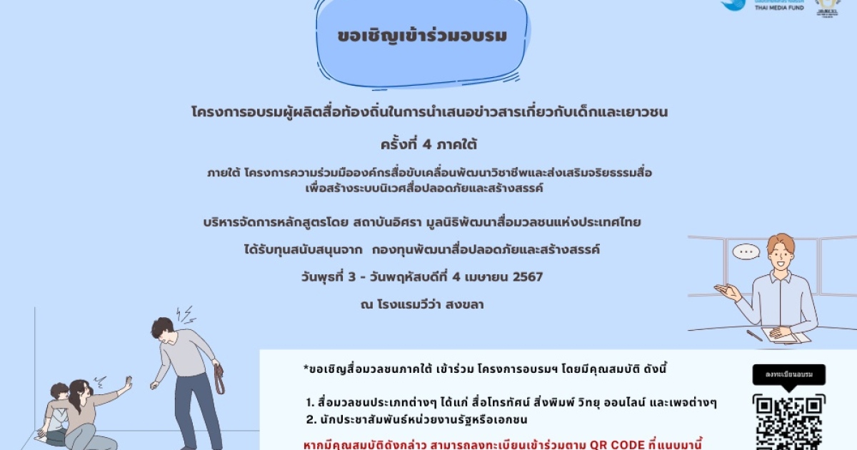 ด้วย สถาบันอิศรา มูลนิธิพัฒนาสื่อมวลชนแห่งประเทศไทย ร่วมกับ กองทุนพัฒนาสื่อปลอดภัยและสร้างสรรค์ จัด “โครงการอบรมผู้ผลิตสื่อท้องถิ่นในการนำเสนอข่าวสารเกี่ยวกับเด็กและเยาวชน ครั้งที่ 4 ภาคใต้ ” ในวันพุธที่ 3 - วันพฤหัสบดีที่ 4 เมษายน 2567 ณ โรงแรมวีว่า สงขลา