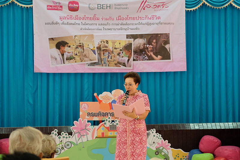 โดยในโอกาสนี้ คณะผู้บริหารได้แก่นางพิตราภรณ์ บุณยรัตพันธุ์ รองประธานกรรมการมูลนิธิเมืองไทยยิ้มพร้อมด้วย นางสาวนิรัตน์ บูชาสุข รองกรรมการผู้จัดการ บริษัท เมืองไทยประกันชีวิต จำกัด (มหาชน) และ นางสาวอนัญญา อัตชู ผู้อำนวยการศูนย์พัฒนาการจัดสวัสดิการสังคมผู้สูงอายุบ้านบางแค ร่วมกิจกรรมเพื่อสรุปผลการดำเนินของ “โครงการแสงแก้ว การคัดกรองและผ่าตัดโรคต้อกระจก เพื่อผู้สูงอายุ” และยังได้จัดกิจกรรมเพื่อสร้างความสุขและรอยยิ้มให้แก่ทุกคนอีกครั้ง