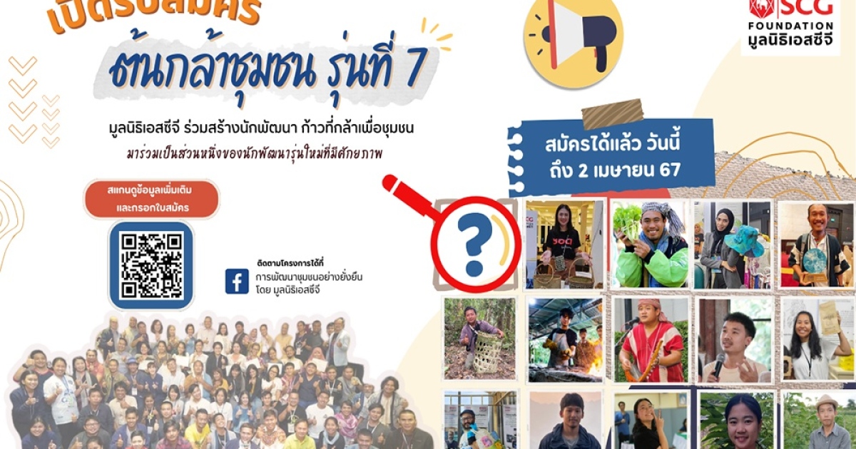 มูลนิธิเอสซีจี ขอเชิญคนรุ่นใหม่ อายุไม่เกิน 35 ปีและมีหัวใจนักพัฒนา ที่ต้องการสร้างความเข้มแข็งอย่างยั่งยืนให้กับบ้านเกิด เข้าร่วมโครงการ “ต้นกล้าชุมชน รุ่นที่ 7” โดยผู้ที่ผ่านการคัดเลือกเป็น ‘ต้นกล้าชุมชน’ ต้องดำเนินโครงการตามที่ถนัดและเป็นประโยชน์ต่อสาธารณะในชุมชน ภายใต้การดูแลและแนะนำจากพี่เลี้ยงที่เป็นนักพัฒนามืออาชีพในท้องถิ่น ตลอดจนเข้าร่วมหลักสูตรพัฒนาศักยภาพตามที่มูลนิธิฯ กำหนดตลอด 3 ปี เพื่อฝึกฝนพัฒนาความรู้ ความสามารถพร้อมเป็นกำลังสำคัญในการสร้างงาน สร้างอาชีพ พัฒนาต่อยอดผลิตภัณฑ์และทุนทางวัฒนธรรมอย่างสร้างสรรค์เพื่อยกระดับคุณภาพชีวิต และสร้างกระบวนการเรียนรู้เพื่ออยู่รอดพึ่งพาตัวเองได้อย่างยั่งยืนต่อไป เปิดรับสมัครแล้ววันนี้ถึง 2 เมษายน 2567