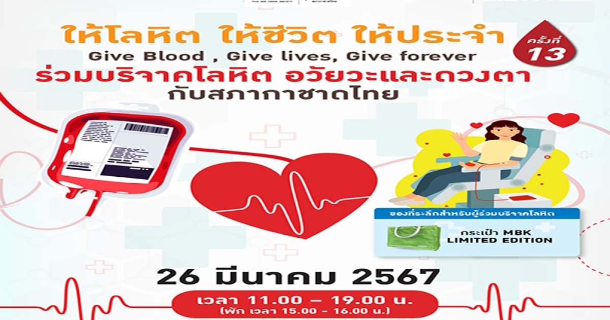 เตรียมร่างกายให้พร้อม!! ศูนย์การค้าเอ็ม บี เค เซ็นเตอร์ เชิญชวนมาเป็นผู้ให้ที่ยิ่งใหญ่ ร่วมกับ ศูนย์บริการโลหิตแห่งชาติและศูนย์รับบริจาคอวัยวะกับ สภากาชาดไทย จัดกิจกรรม ให้โลหิต ให้ชีวิต ให้ประจำ Give Blood, Give lives, Give forever ครั้งที่ 13 ในวันอังคารที่ 26 มีนาคม 2567 บริเวณชั้น 4 โซน D ตั้งแต่เวลา 11.00 น. – 19.00 น.
