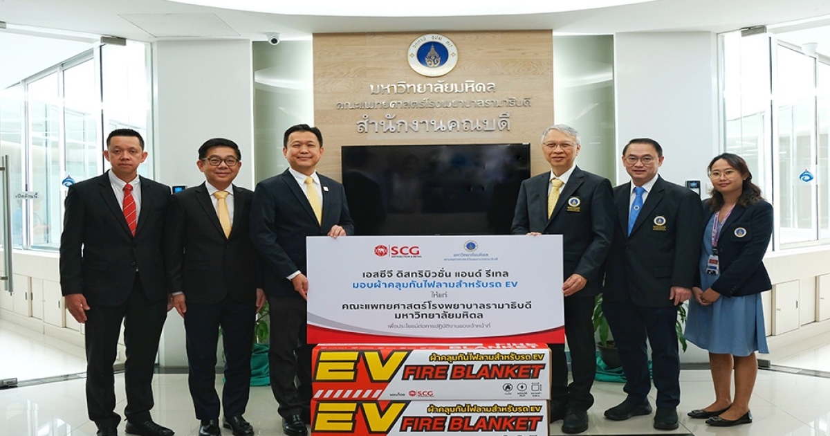 เอสซี นำโดยนายวิโรจน์ รัตนชัยสิทธิ์ กรรมการผู้จัดการใหญ่ ธุรกิจเอสซีจี ดิสทริบิวชั่น แอนด์ รีเทล (ที่ 3 จากซ้าย) พร้อมด้วยนายอนุวัตร เฉลิมไชย Chief Marketing Officer บริษัทเอสซีจี ดิสทริบิวชั่น จำกัด (ที่ 2 จากซ้าย) และนายศรัณย์ วงศ์รัตน์ Merchandise and Sourcing Director บริษัทเอสซีจี ดิสทริบิวชั่น จำกัด (ที่ 1 จากซ้าย) ร่วมมอบผ้าคลุมกันไฟลามสำหรับยานยนต์ไฟฟ้า (EV Fire Blanket) ให้แก่คณะแพทยศาสตร์โรงพยาบาลรามาธิบดี มหาวิทยาลัยมหิดล โดยมี ศ.คลินิก นพ.อาทิตย์ อังกานนท์ คณบดีคณะแพทยศาสตร์โรงพยาบาลรามาธิบดี มหาวิทยาลัยมหิดล (ที่ 3 จากขวา) และ ผศ.นพ.ภุชงค์ ลิขิตธนสมบัติ รองคณบดีฝ่ายกายภาพและสิ่งอำนวยความสะดวก คณะแพทยศาสตร์โรงพยาบาลรามาธิบดี มหาวิทยาลัยมหิดล (ที่ 2 จากขวา) เป็นผู้รับมอบ