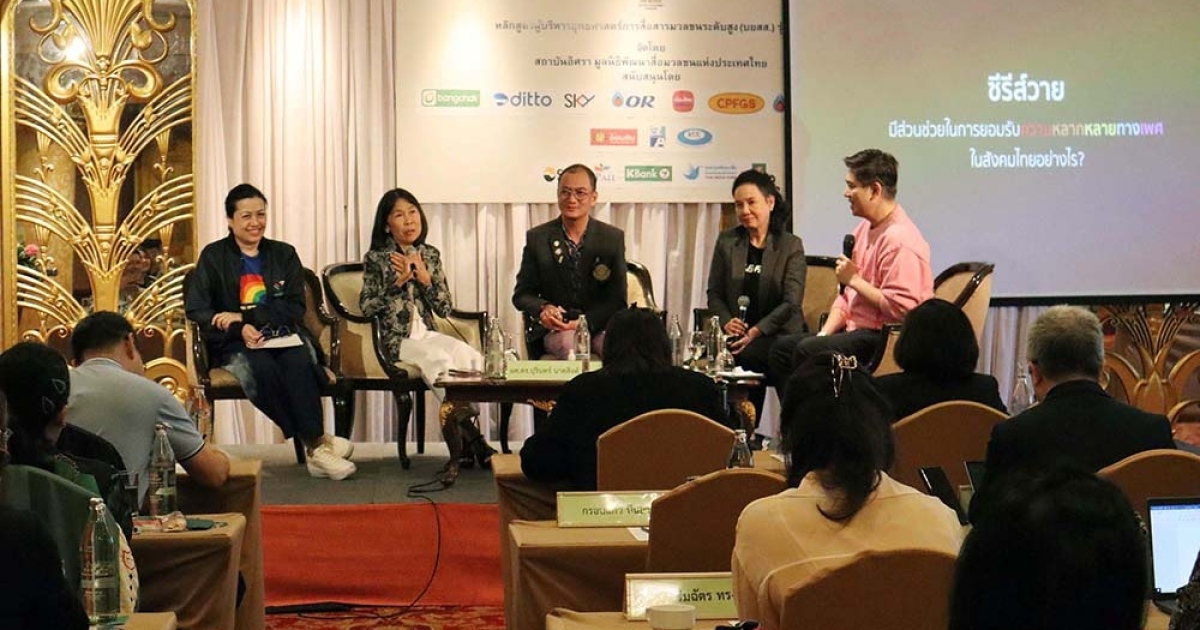 นางสาวอมรรัตน์ มหิทธิรุกข์ ผู้จัดการหลักสูตร พร้อมด้วย นายเอกลักษณ์ วิริยะโกวิทยา ประธานกลุ่มที่ 5 และ ผู้เข้าอบรมหลักสูตรผู้บริหารยุทธศาสตร์การสื่อสารมวลชนระดับสูง (บยสส.) รุ่นที่ 3 กลุ่มที่ 5 ให้การต้อนรับ นางสายทิพย์ มนตรีกุล ณ อยุธยา CHIEF EXECUTIVE OFFICER (CEO) บริษัท CHANGE2561 จำกัด และผศ.ดร.ปุรินทร์ นาคสิงห์ หัวหน้าภาควิชาสังคมวิทยาและมานุษยวิทยา คณะสังคมศาสตร์ มหาวิทยาลัยเกษตรศาสตร์ ในโอกาสเสวนาสัมมนากลุ่มย่อย กลุ่มที่ 5 หัวข้อ “ซีรีย์วายกับการขับเคลื่อนกลุ่ม LGBTQ+ ในสังคมไทย? และการผลักดัน ซีรี่ย์วาย ให้เป็น Soft Power ที่แข็งแรงอีกด้านของประเทศไทย” เมื่อวันเสาร์ที่ 23 มีนาคม 2567 ณ ห้องมรกต ชั้น 3 โรงแรม ดิ เอมเมอรัลด์ - กรุงเทพฯ ถนนรัชดาภิเษก