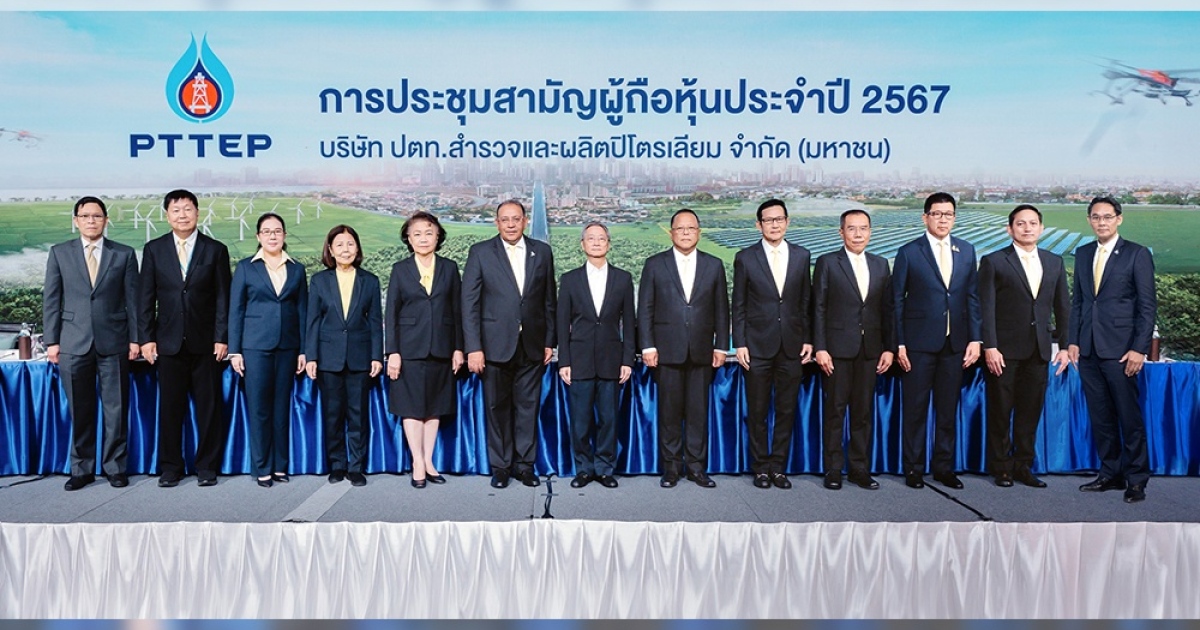 นายไกรฤทธิ์ อุชุกานนท์ชัย (กลาง) ประธานกรรมการ บริษัท ปตท.สำรวจและผลิตปิโตรเลียม จำกัด (มหาชน) หรือ ปตท.สผ. พร้อมด้วยคณะกรรมการบริษัท และนายมนตรี ลาวัลย์ชัยกุล (ที่ 6 จากซ้าย) ประธานเจ้าหน้าที่บริหาร ปตท.สผ. จัดการประชุมสามัญผู้ถือหุ้นประจำปี 2567 เพื่อรายงานผลการดำเนินงานของบริษัทในปีที่ผ่านมา ความคืบหน้าในการดำเนินงานเพื่อเป้าหมายการปล่อยก๊าซเรือนกระจกสุทธิเป็นศูนย์ (Net Zero Greenhouse Gas Emissions) และแผนการลงทุนในอนาคต ทั้งนี้ ที่ประชุมมีมติอนุมัติการจ่ายเงินปันผลประจำปี 2566 ในอัตราหุ้นละ 9.50 บาท