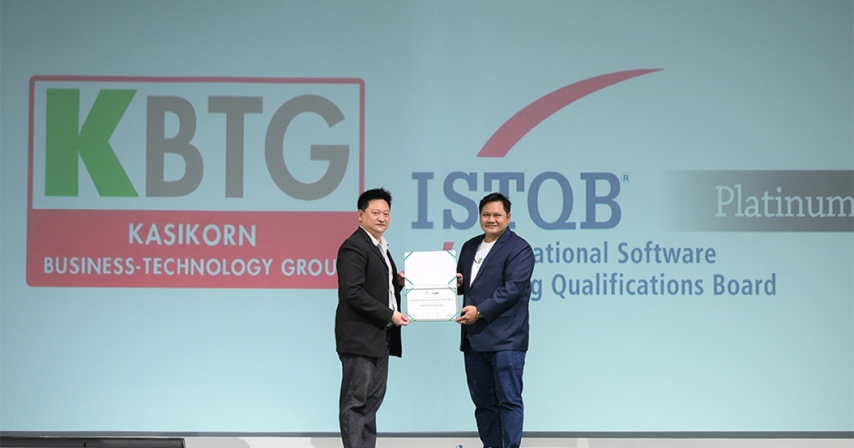 นายเรืองโรจน์ พูนผล (ขวา) ประธานกลุ่มบริษัท กสิกร บิซิเนส-เทคโนโลยี กรุ๊ป (KBTG) และนายสิทธิชัย อุดมโชคปิติ (ซ้าย) ประธานสมาชิกประจำประเทศไทยของ International Software Testing Qualifications Board (ISTQB) องค์กรทดสอบคุณภาพซอฟต์แวร์ระดับโลก ซึ่งเป็นองค์กรอิสระสากลไม่แสวงหากำไรและมีอาสาสมัครที่เป็นสมาชิกกว่า 60 ประเทศทั่วโลก ร่วมพิธีลงนามการเข้าร่วมเป็นพันธมิตรระหว่างกัน โดย KBTG ถือเป็นองค์กรแรกของไทยที่ได้รับการรับรองวิทยฐานะจาก ISTQB ในระดับ Platinum Partner จากความร่วมมือในการตรวจสอบมาตรฐานผลิตภัณฑ์อย่างต่อเนื่อง รวมทั้งการพัฒนาทักษะพนักงาน KBTG ทุกคนในหน่วยงานบริหารจัดการคุณภาพซอฟต์แวร์กว่า 200 คน ผ่านการอบรม สอบวัดระดับ จนได้รับประกาศนียบัตรด้านการบริหารจัดการการทดสอบซอฟต์แวร์ทั้งในระดับพื้นฐานและระดับแอดวานซ์ รวมแล้วกว่า 300 ประกาศนียบัตร ตอกย้ำยุทธศาสตร์ในการเป็นสุดยอดองค์กรเทคโนโลยีในระดับภูมิภาคเอเชียตะวันออกเฉียงใต้และบทบาทการเป็นผู้เชี่ยวชาญด้าน World-class Technology ที่ให้ความสำคัญกับการส่งเสริมศักยภาพทีมงาน และการรักษาคุณภาพของซอฟต์แวร์เพื่อส่งมอบผลิตภัณฑ์และบริการที่ได้มาตรฐานให้แก่ลูกค้าของธนาคารกสิกรไทย ผลักดันมาตรฐานการทดสอบคุณภาพซอฟต์แวร์ทั้งในระดับประเทศและระดับสากล ณ อาคาร KBTG เมื่อเร็ว ๆ นี้