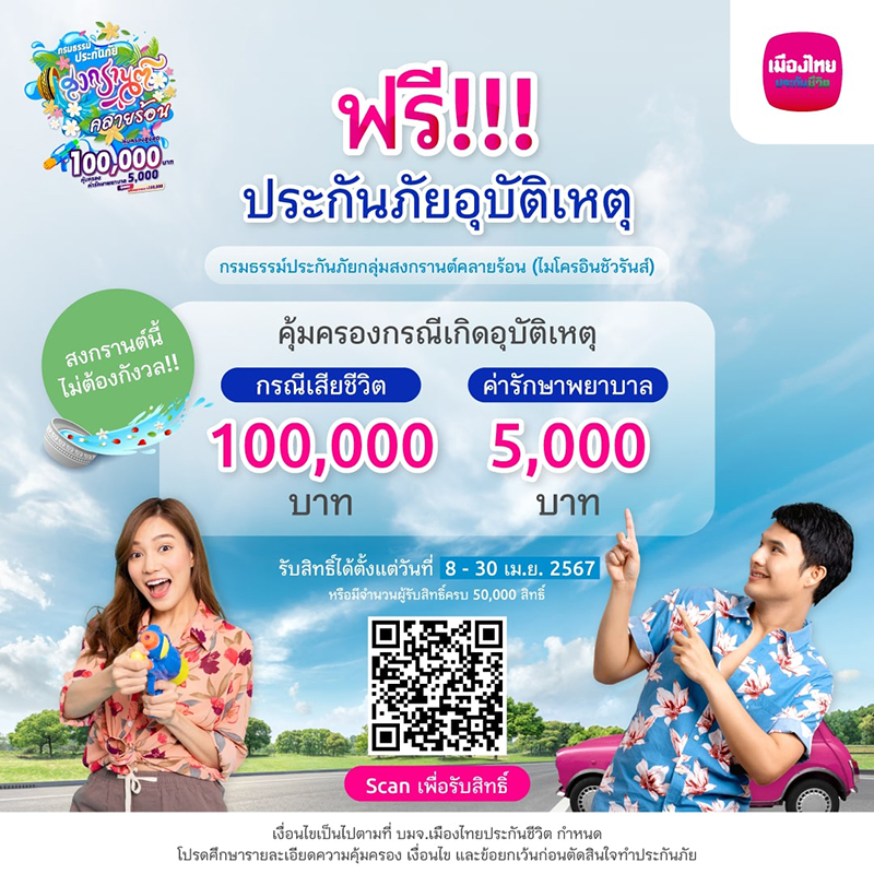เมืองไทยประกันชีวิต จึงขอมอบความอุ่นใจที่มากขึ้นในช่วงเทศกาลสงกรานต์ ซึ่งเป็นเทศกาลแห่งความสุขของทุกคน ด้วยการมอบความคุ้มครอง “กรมธรรม์ประกันภัยกลุ่มสงกรานต์คลายร้อน (ไมโครอินชัวรันส์)” ฟรี… ซึ่งเป็นประกันภัยอุบัติเหตุกลุ่มที่ให้ความคุ้มครองครอบคลุมทั้งด้านชีวิตและค่ารักษาพยาบาลเนื่องจากอุบัติเหตุ ให้กับประชาชาชนทั่วไป โดยสามารถกดรับสิทธิ์และลงทะเบียนผ่าน Link หรือ QR Code บนช่องทาง Social Media ของบริษัทฯ ประกอบด้วย ช่องทาง Facebook, Instagram, Line Official Account ของ Muang Thai Life โดยสามารถรับสิทธิ์ได้ตั้งแต่วันที่ 8 – 30 เมษายน 2567 หรือ มีผู้รับสิทธิ์ครบจำนวน 50,000 สิทธิ์ โดยผู้ที่ลงทะเบียนสำเร็จจะได้รับ SMS ยืนยันความคุ้มครอง