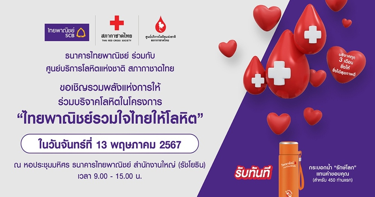 ธนาคารไทยพาณิชย์ ร่วมกับ ศูนย์บริการโลหิตแห่งชาติ สภากาชาดไทย ขอเชิญร่วมบริจาคโลหิต ภายใต้โครงการ “ไทยพาณิชย์รวมใจไทยให้โลหิต” ในวันจันทร์ที่ 13 พฤษภาคม 2567 เวลา 9.00-15.00 น. ณ หอประชุมมหิศร ธนาคารไทยพาณิชย์ สำนักงานใหญ่ (รัชโยธิน) เพื่อเติมเต็มและส่งต่อโลหิตที่มีคุณภาพให้มีเพียงพอต่อการรักษาพยาบาลผู้ป่วยทั่วประเทศ ยังมีผู้ป่วยจำนวนมากที่กำลังรอรับโลหิตเพื่อต่อลมหายใจ ทุก ๆ การบริจาคโลหิต 1 ครั้ง สามารถนำไปช่วยชีวิตผู้ป่วยได้มากกว่า 3 ชีวิต สำหรับ 450 ท่านแรกที่ร่วมบริจาคโลหิต รับทันทีกระบอกน้ำ “รักษ์โลก” แทนคำขอบคุณ