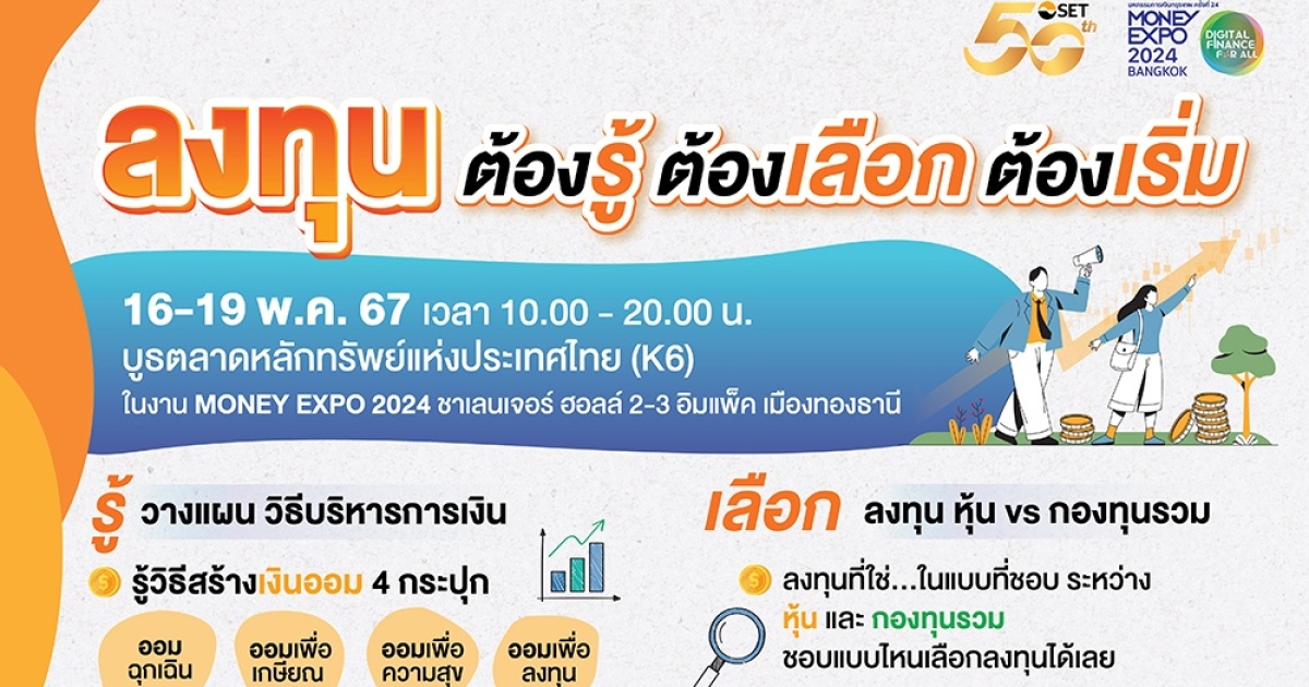 พบกันที่บูธตลาดหลักทรัพย์ฯ (K6) ในมหกรรมการเงิน Money Expo 2024 Bangkok ระหว่างวันที่ 16-19 พ.ค. 2567 เวลา 10.00-20.00 น. ชาเลนเจอร์ ฮอลล์ 2-3 อิมแพ็ค เมืองทองธานี
