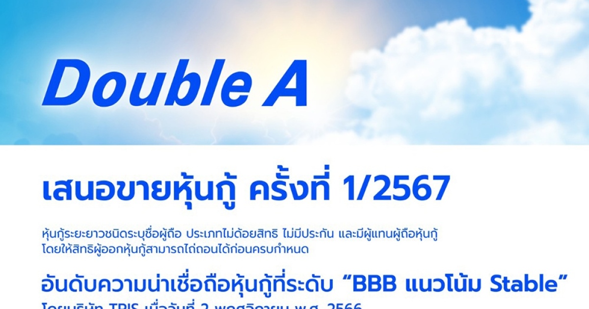 ดั๊บเบิ้ล เอ เตรียมออกหุ้นกู้ 1/2567 ดอกเบี้ยสูงสุด 5.80% เปิดจองซื้อ 1-4 ก.ค.นี้