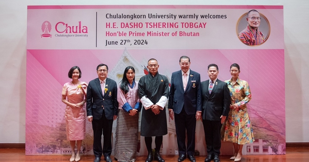 ศาสตราจารย์พิเศษดร.สุรเกียรติ์ เสถียรไทย นายกสภาจุฬาลงกรณ์มหาวิทยาลัย และ ศาสตราจารย์ ดร.วิเลิศ ภูริวัชร ผู้รักษาการอธิการบดีจุฬาฯ ต้อนรับดาโช เชริง โตบเกย์ (Hon’ble Dasho Tshering Tobgay) นายกรัฐมนตรีแห่งราชอาณาจักรภูฏาน พร้อมด้วย H.E. Mr. D.N. Dhungyel รัฐมนตรีว่าการกระทรวงการต่างประเทศและการค้าระหว่างประเทศ และ H.E. Mr. Tshering รัฐมนตรีว่าการกระทรวงมหาดไทย ในโอกาสที่ดาโช เชริง โตบเกย์ นายกรัฐมนตรีแห่งราชอาณาจักรภูฏานมาปาฐกถาพิเศษที่จุฬาลงกรณ์มหาวิทยาลัย ในหัวข้อ “Enlightened Leadership” เมื่อวันที่ 27 มิถุนายน 2567 ณ หอประชุมจุฬาฯ โดยมีนายวราวุธ ศิลปอาชา รัฐมนตรีว่าการกระทรวงการพัฒนาสังคมและความมั่นคงของมนุษย์ ปฏิบัติหน้าที่รัฐมนตรีเกียรติยศประจำนายกรัฐมนตรีราชอาณาจักรภูฏาน ร่วมต้อนรับ