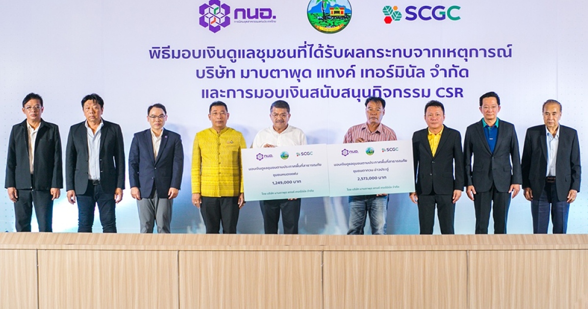 จังหวัดระยอง ร่วมกับ กนอ. และ SCGC เร่งเดินหน้ามอบเงินดูแลชุมชนที่ได้รับผลกระทบ จากเหตุการณ์ มาบตาพุด แทงค์ เทอร์มินัล พร้อมสนับสนุนงบกิจกรรม CSR เพื่อสร้างสาธารณประโยชน์ให้กับชุมชน