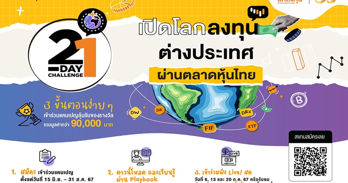 ตลาดหลักทรัพย์ฯ เปิดตัวแคมเปญ “21-Day Challenge เปิดโลกลงทุนต่างประเทศ ผ่านตลาดหุ้นไทย” ภารกิจใหม่ท้าทายตัวเองใน 21 วัน เรียนรู้เนื้อหาการลงทุนต่างประเทศผ่านผลิตภัณฑ์การลงทุนในตลาดหลักทรัพย์แห่งประเทศไทยอย่าง DR DRx ETF เรียนรู้ผ่านสื่อความรู้ที่หลากหลาย เน้นประยุกต์ใช้ในการลงทุนได้จริง ตอบโจทย์ผู้ลงทุนรุ่นใหม่ที่ค้นหาโอกาสสร้างผลตอบแทนจากการลงทุน คาดปีนี้มีผู้สนใจเข้าร่วมเรียนรู้กว่า 10,000 คน