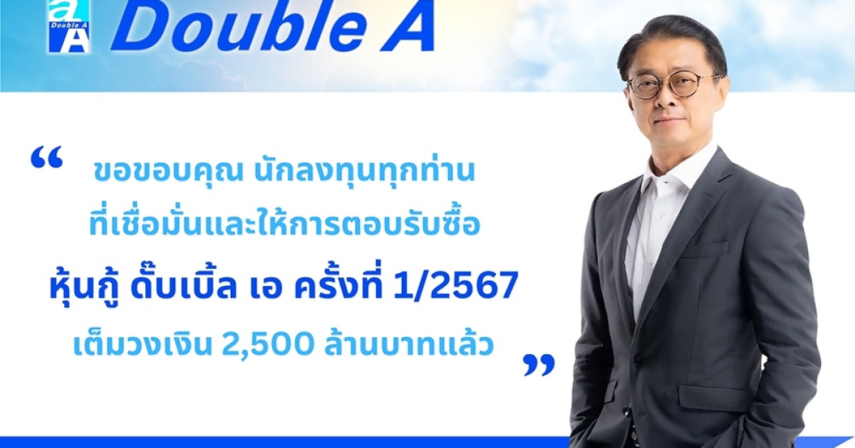 ดั๊บเบิ้ล เอ ปิดการจำหน่ายหุ้นกู้มูลค่ารวม 2,500 ล้านบาทได้ภายในเวลาอันรวดเร็ว สะท้อนความเชื่อมั่นของนักลงทุนต่อความแข็งแกร่งและศักยภาพการเติบโตของ ดั๊บเบิ้ล เอ และที่มีต่อตลาดทุนของประเทศไทย