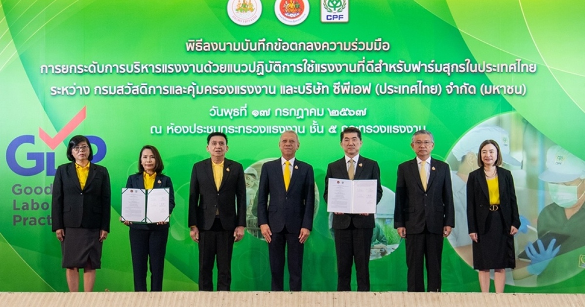 กระทรวงแรงงาน โดย กรมสวัสดิการและคุ้มครองแรงงาน หรือ กสร. และบริษัท ซีพีเอฟ (ประเทศไทย) จำกัด (มหาชน) ในกลุ่มบริษัทเจริญโภคภัณฑ์อาหาร จำกัด (มหาชน) หรือ ซีพีเอฟ ลงนามข้อตกลงความร่วมมือ “ขับเคลื่อนแนวปฏิบัติการใช้แรงงานที่ดี” (GLP) สำหรับฟาร์มสุกรในประเทศไทย ตั้งเป้าฟาร์มสุกรซีพีเอฟทั้งหมด 106 แห่งทั่วประเทศสามารถผ่านการรับรองครบ 100% ได้ภายใน 1 ปี พร้อมขยายผลสู่เกษตรกรในโครงการส่งเสริมอาชีพเกษตรกรรายย่อย 4,000 ราย เพิ่มขีดความสามารถสินค้าเกษตรสู่ระดับสากลและยั่งยืน